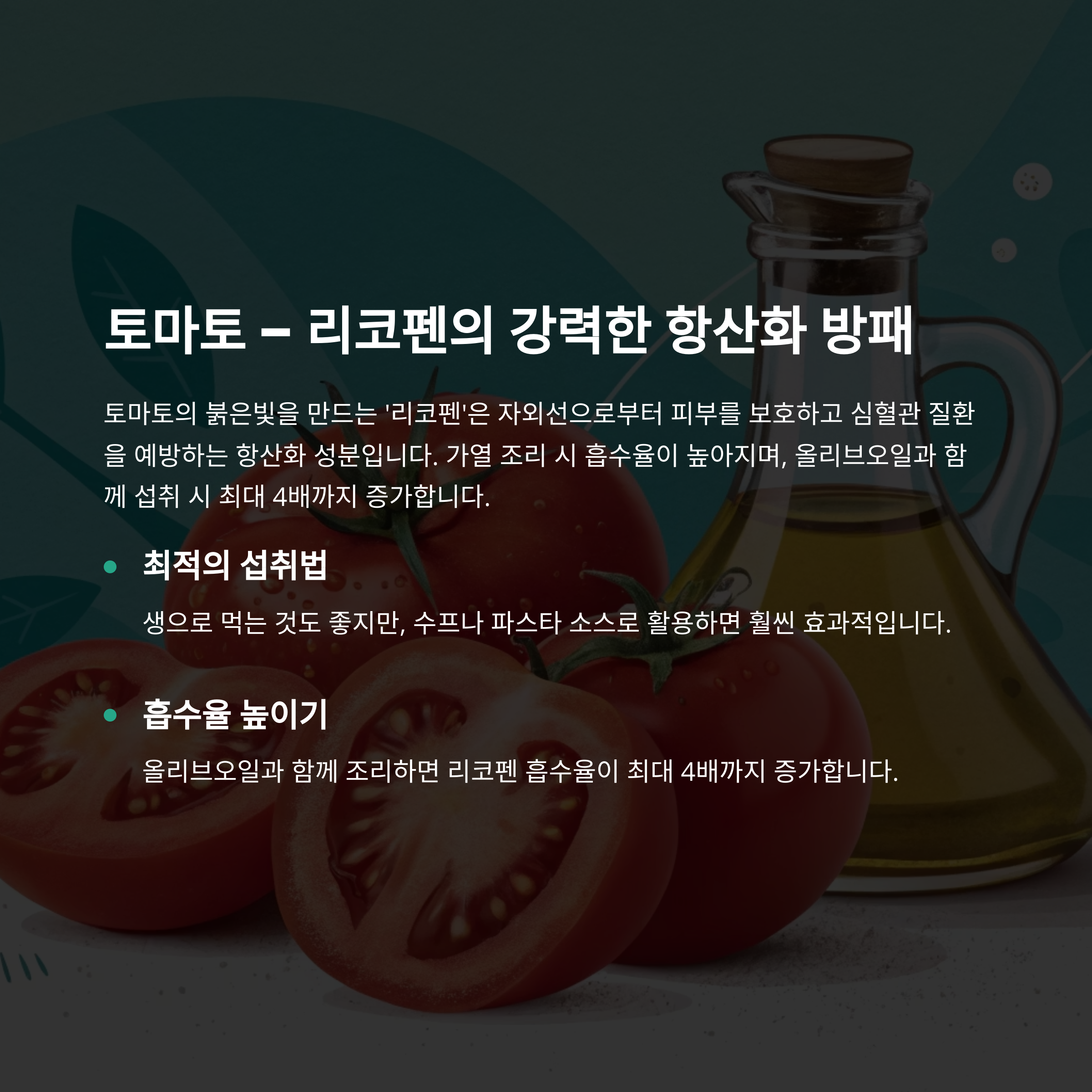 | 토마토 | 리코펜 | 심혈관, 피부 보호 | 가열조리, 올리브유와 |