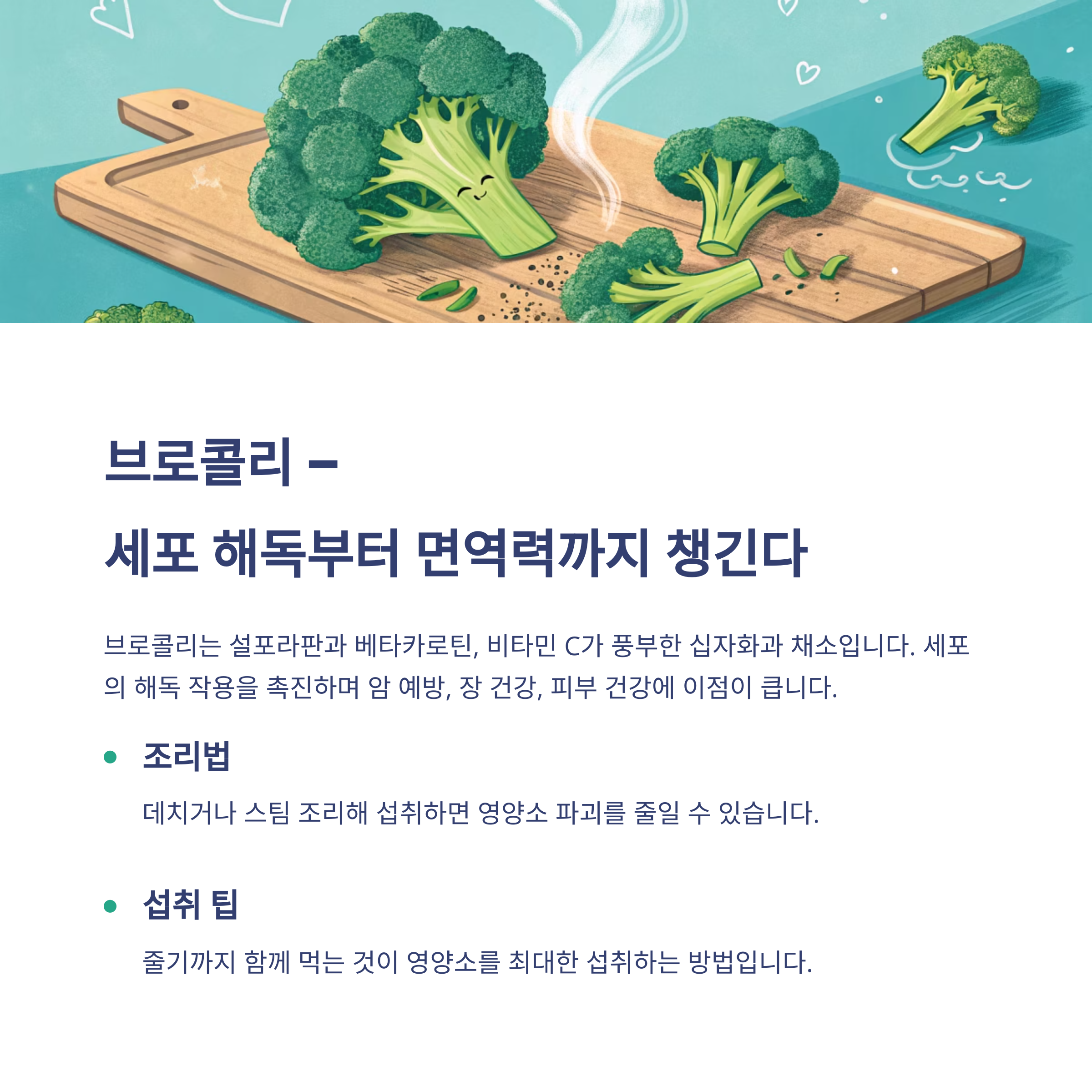 세포의 해독 작용을 촉진하며 암 예방, 장 건강, 피부 건강에 이점이 큽니다. 데치거나 스팀 조리해 섭취하면 영양소 파괴를 줄일 수 있고, 줄기까지 함께 먹는 것이 좋습니다.