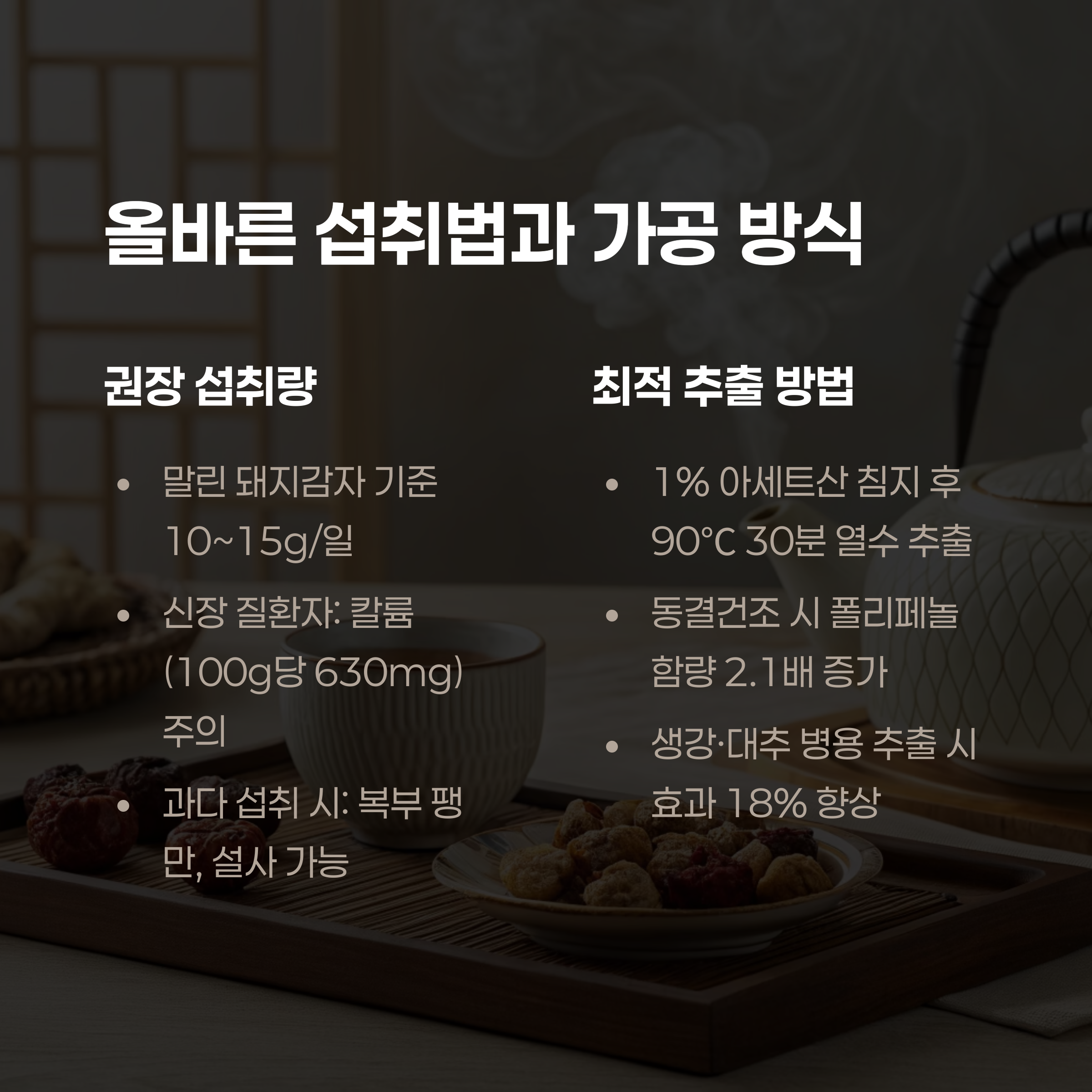 - 1일 권장량: 말린 돼지감자 기준 10~15g