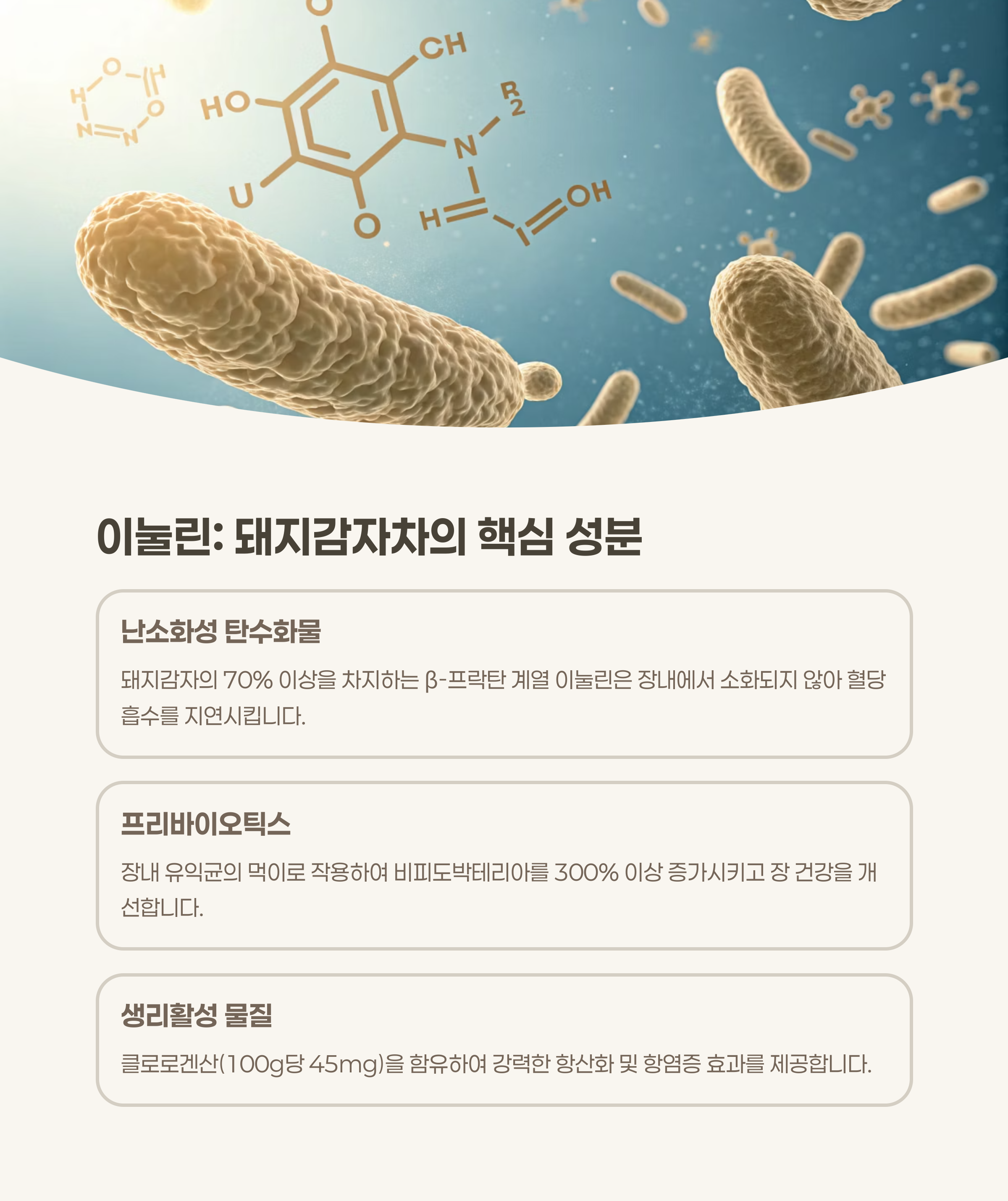 돼지감자차는 **이눌린(inulin)**이라는 난소화성 탄수화물을 다량 함유하고 있어
