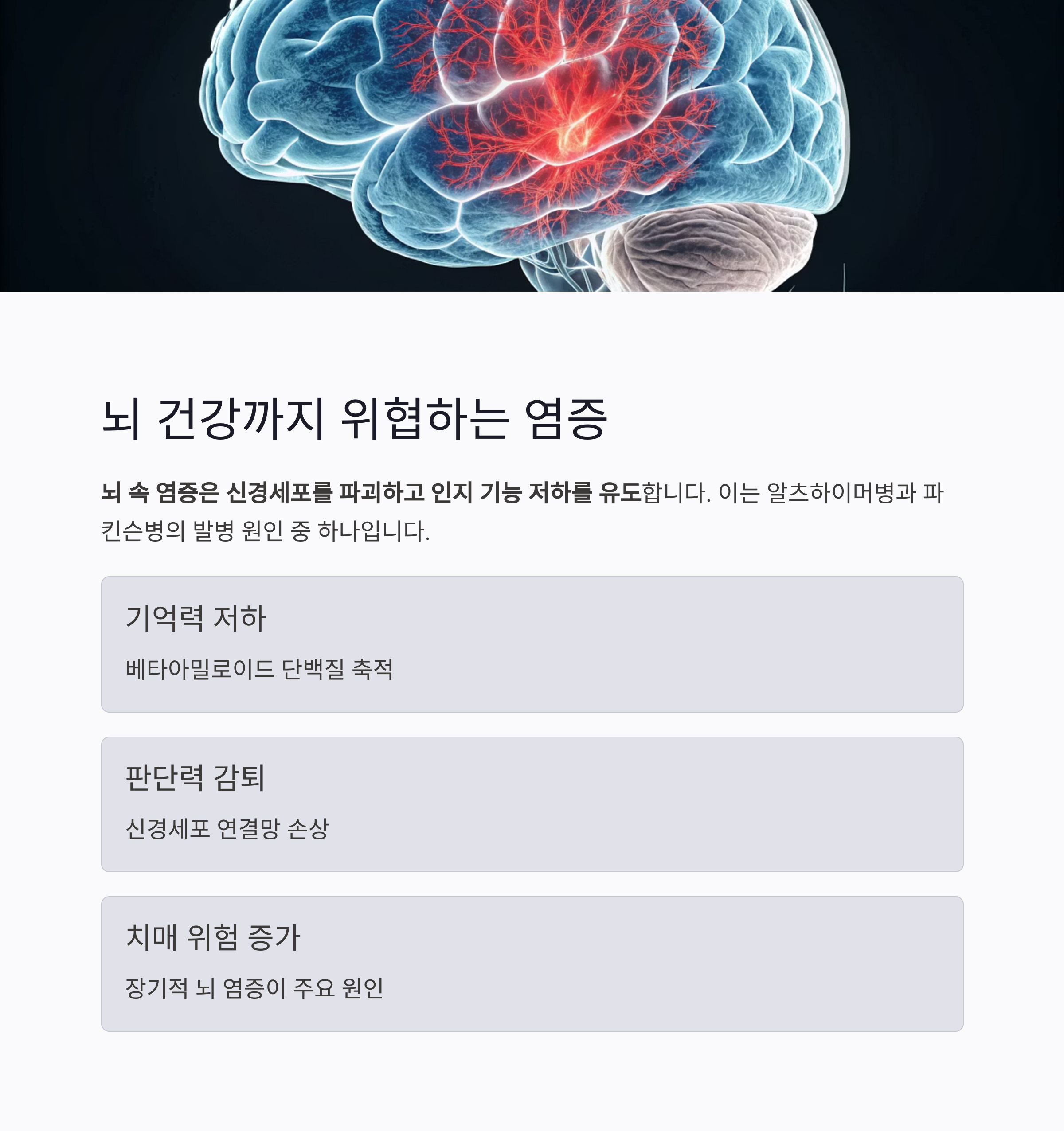 "염증은 뇌에도 침투한다"는 말처럼, 뇌 속 염증은 신경세포를 파괴하고 인지 기능 저하를 유도합니다.
