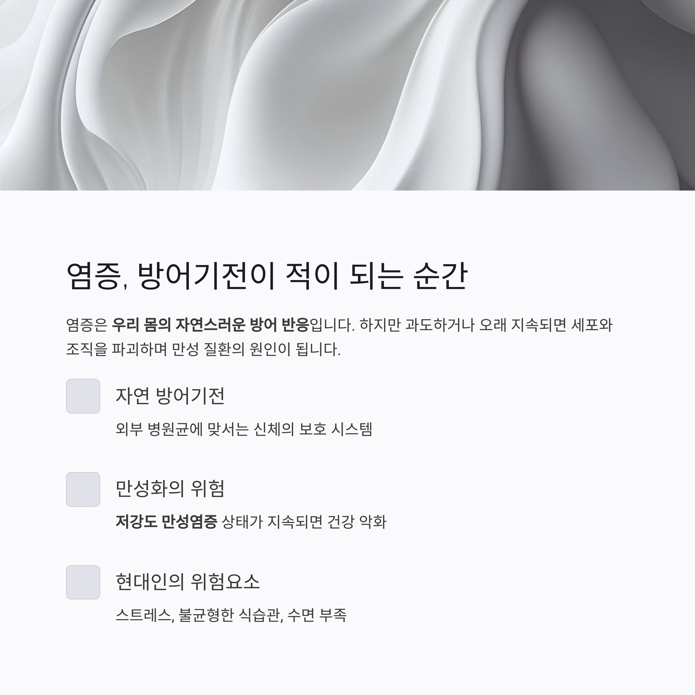하지만 이 반응이 과도하거나 오래 지속될 경우, 오히려 세포와 조직을 파괴하며 만성 질환의 원인이 됩니다.