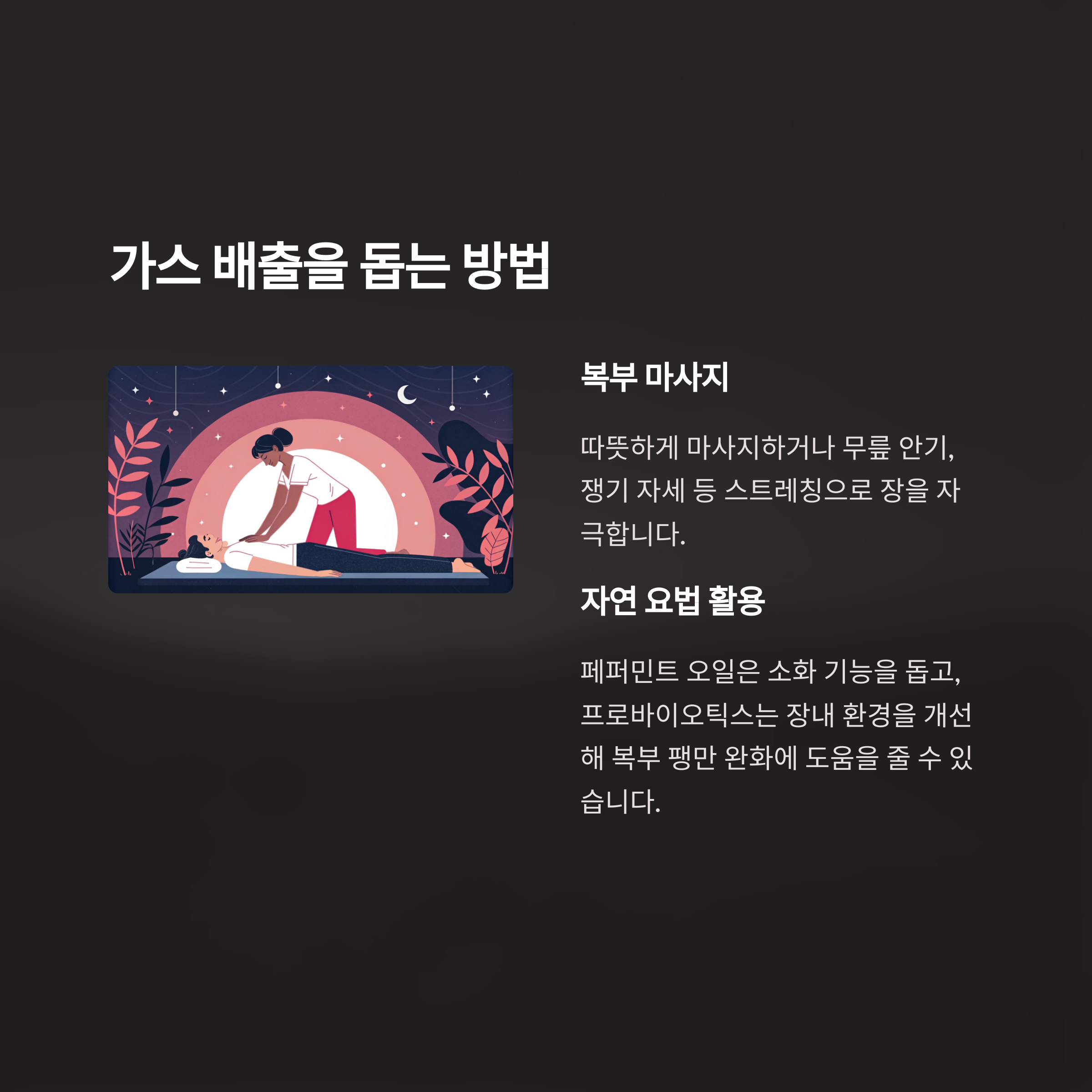 | 복부 마사지 | 장 자극, 가스 배출 유도 |