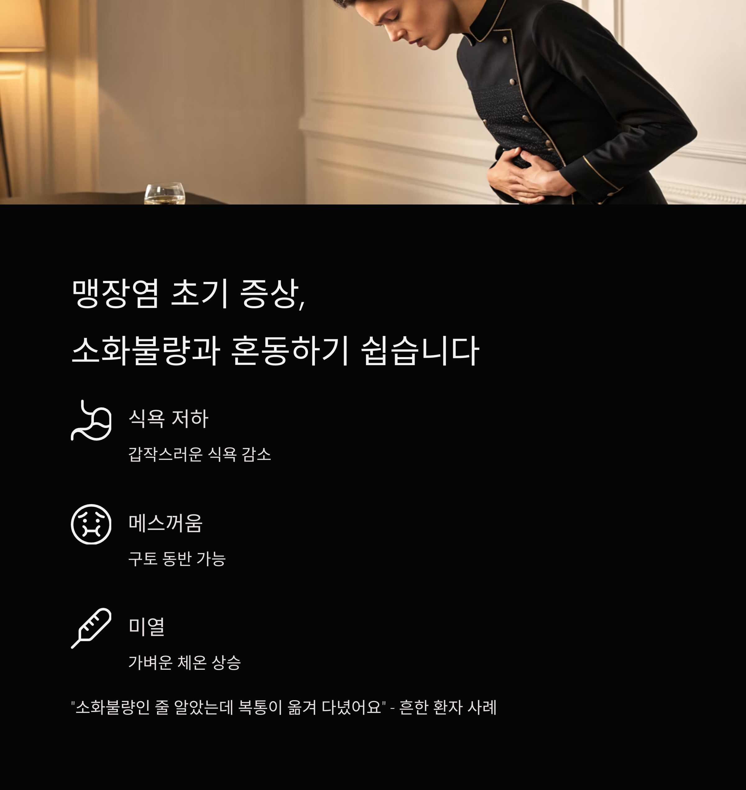 초기 맹장염은 위장염, 요로감염, 난소질환 등과 혼동되기 쉽습니다.