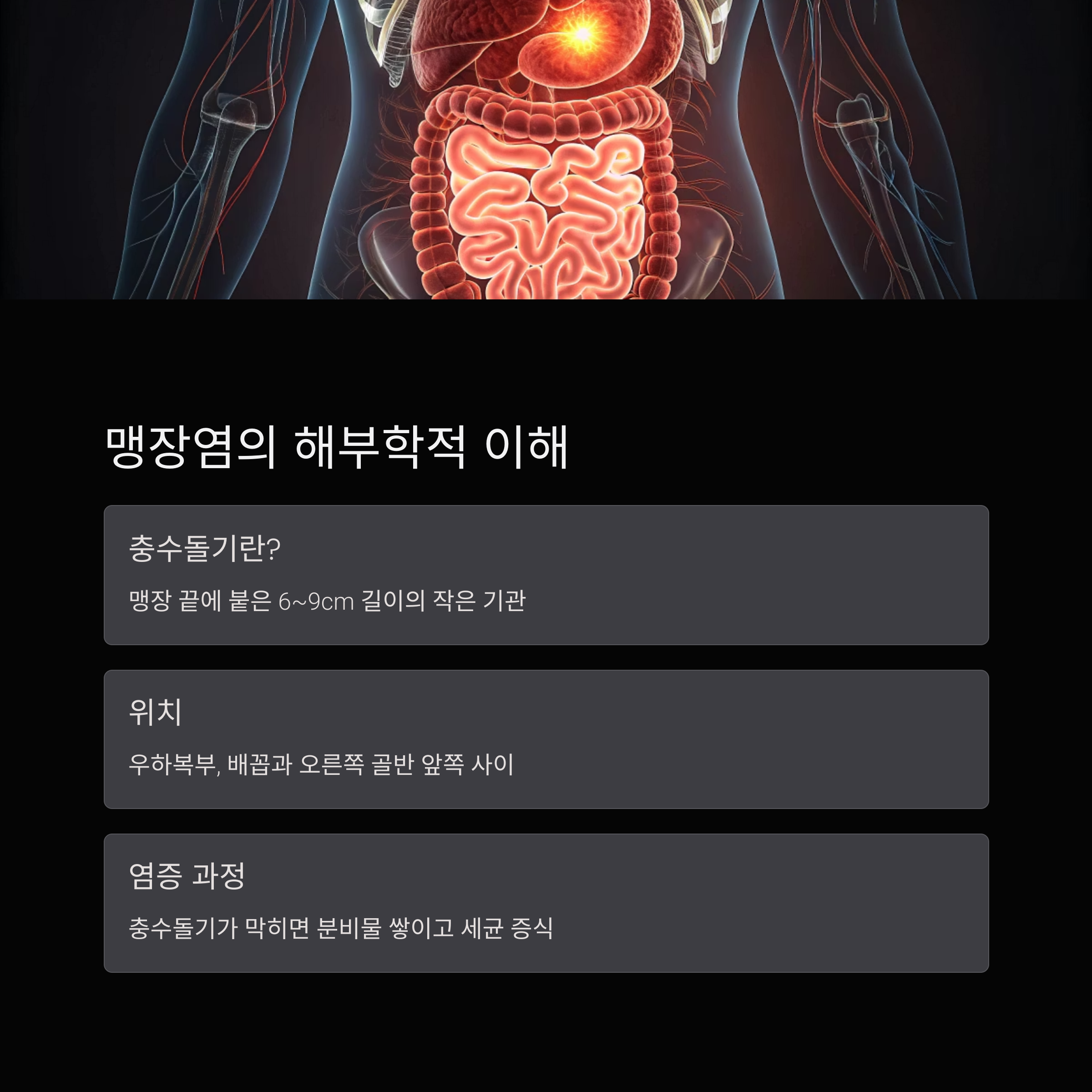 글에서는 맹장염 초기 증상, 해부학적 특성, 연령별 차이, 진단 시 주의사항까지