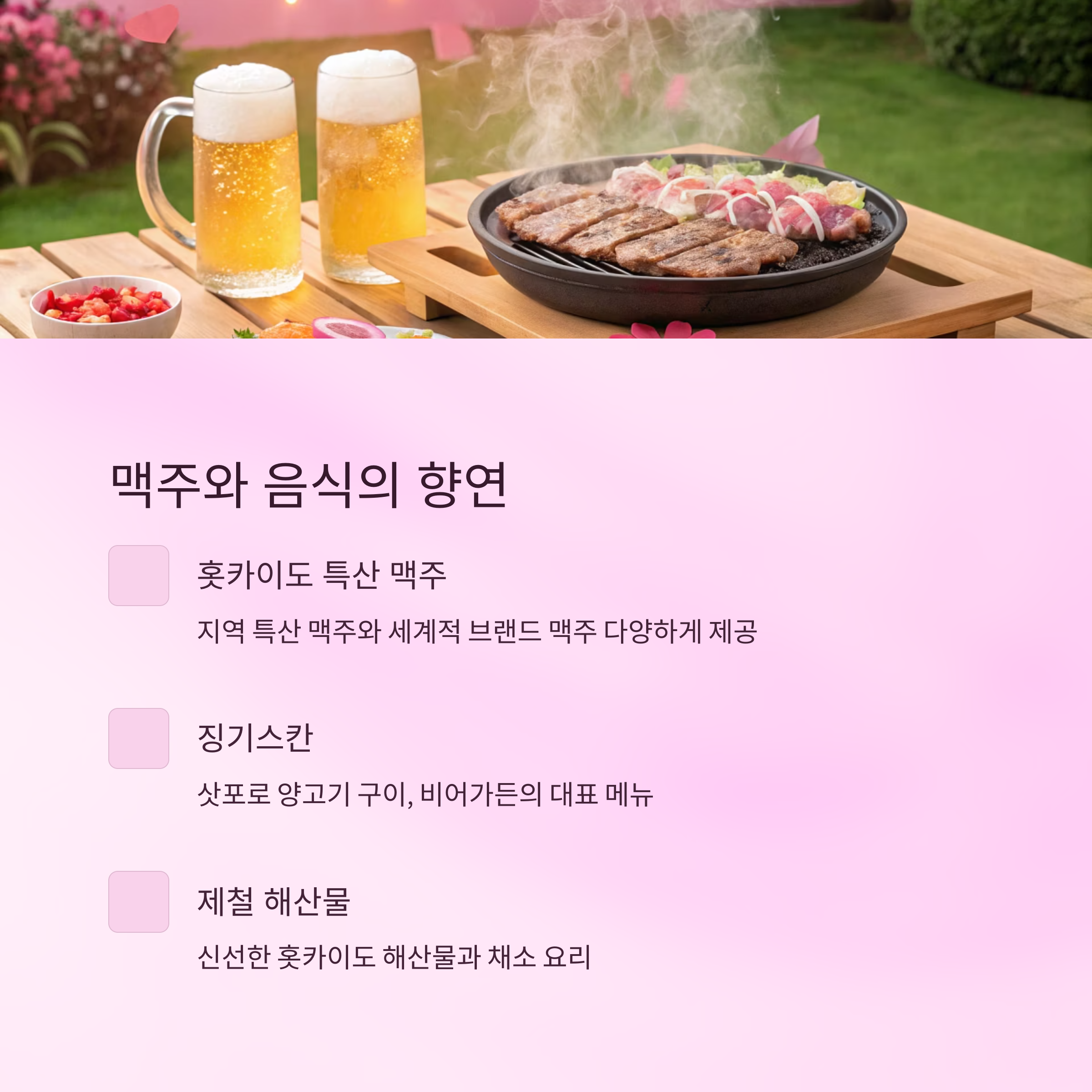 | 비어가든에서는 홋카이도의 신선한 특산물을 활용한 메뉴가 다양합니다. 특히 징기스칸 양고기 구이는 현지 유명 요리로 많은 인기를 끌고 있습니다. 이 외에도 제철 해산물 요리, 신선한 채소 샐러드를 제공하여 풍미를 더합니다. 독창적인 홋카이도 맥주와 잘 어울리는 안주 구성도 다양하게 마련되어 있습니다. 방문객들은 음식을 통해 홋카이도의 풍부한 미식 경험을 체험할 수 있습니다. |