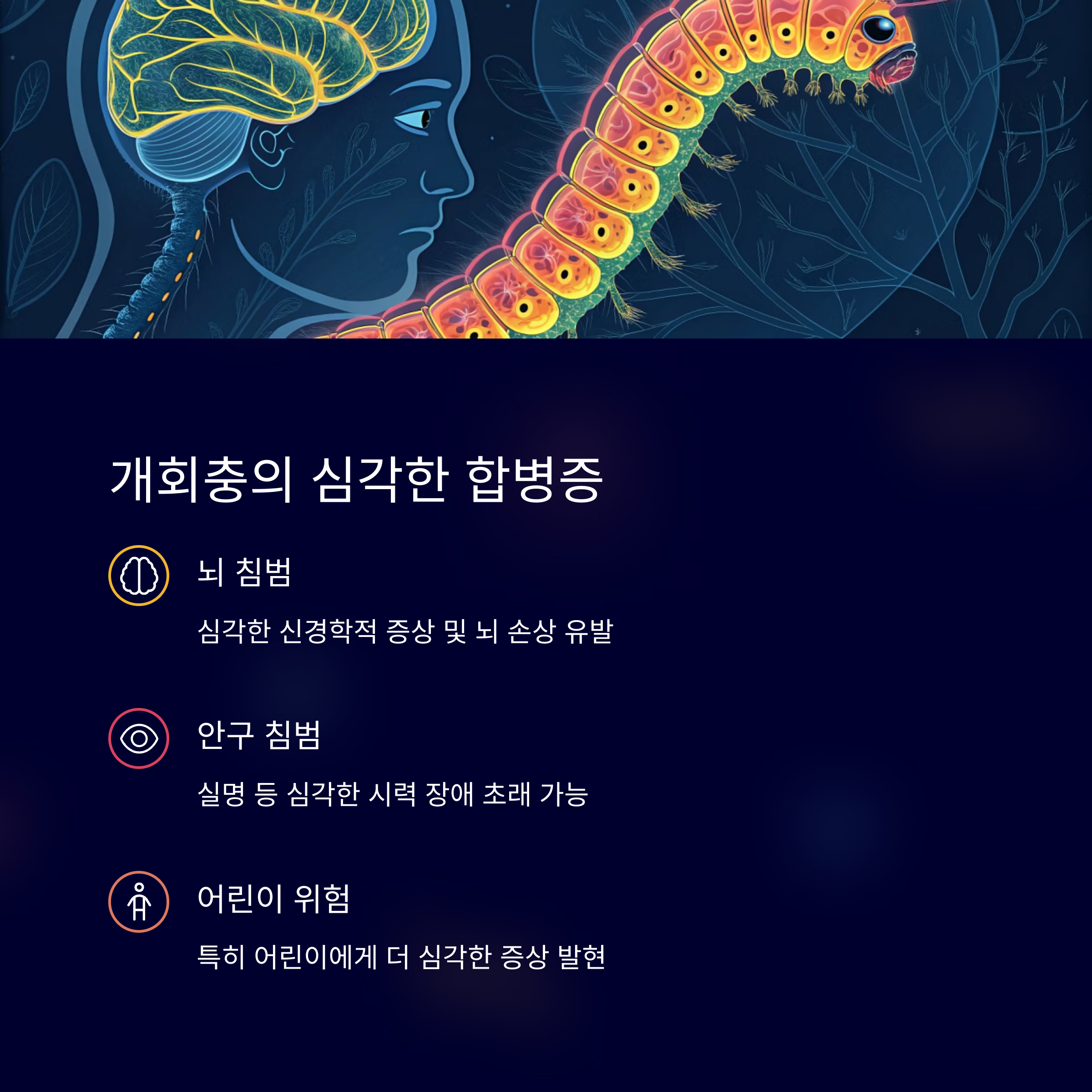 그 결과 "시력 저하", "망막 염증", "간 종대", "뇌경색"까지 유발될 수 있습니다. 특히 소아와 면역력이 약한 사람은 중추신경계 합병증으로 이어질 수 있어 매우 치명적입니다.