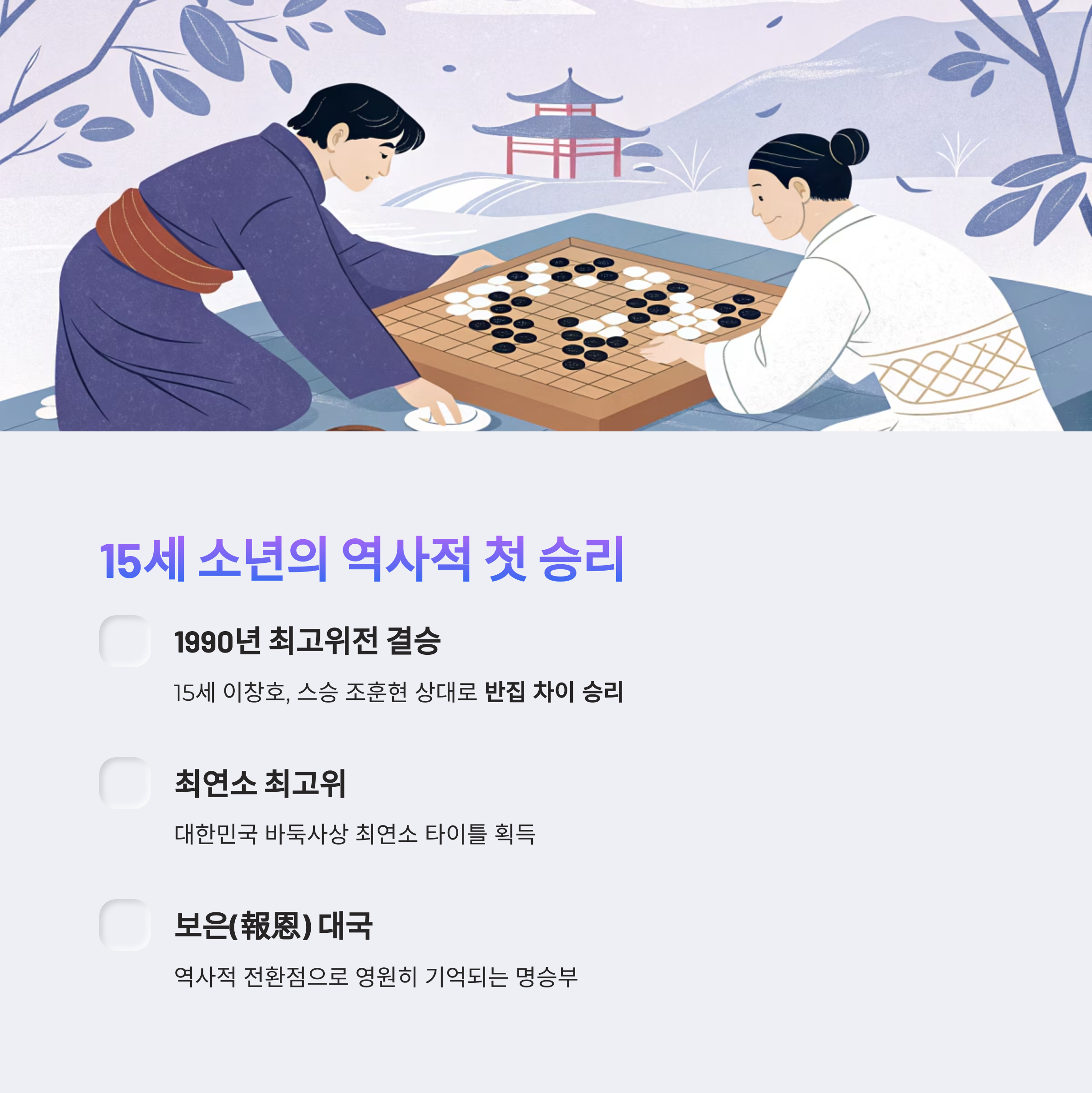 15세의 이창호는 스승 조훈현을 상대로 반집 차이의 승리를 거두며