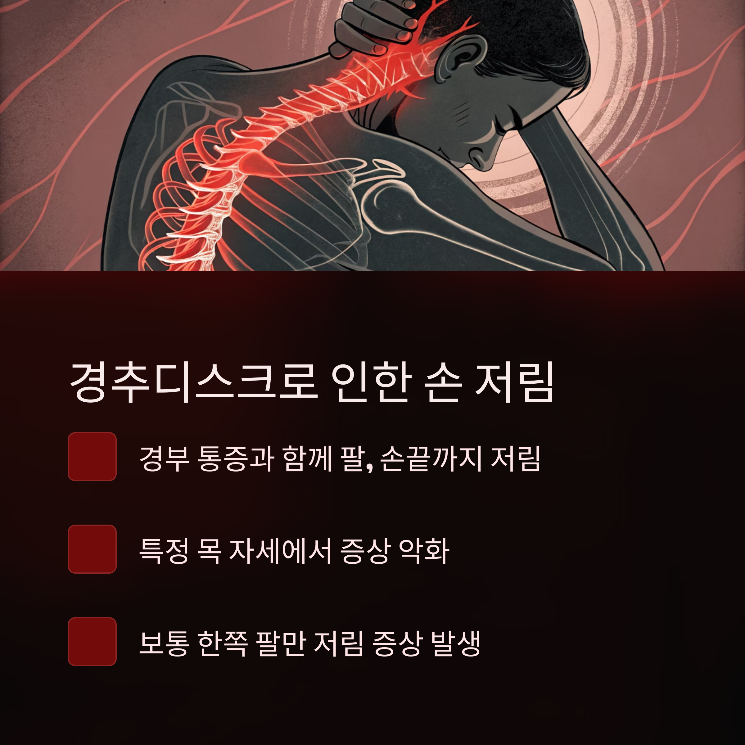 - 경부 통증과 함께 팔 전체 혹은 손끝까지의 저림