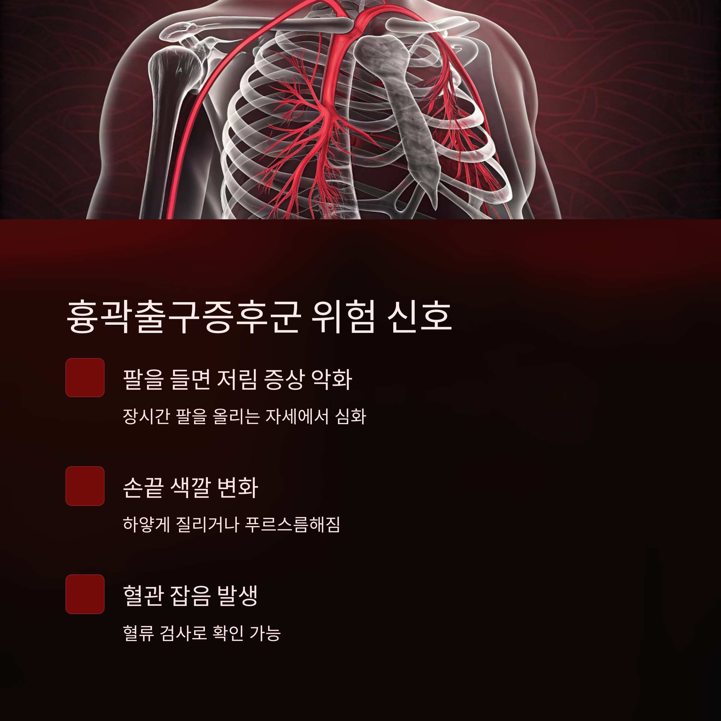팔을 들면 증상이 심해지고, 혈관 잡음이나 손 차가움이 동반됩니다.