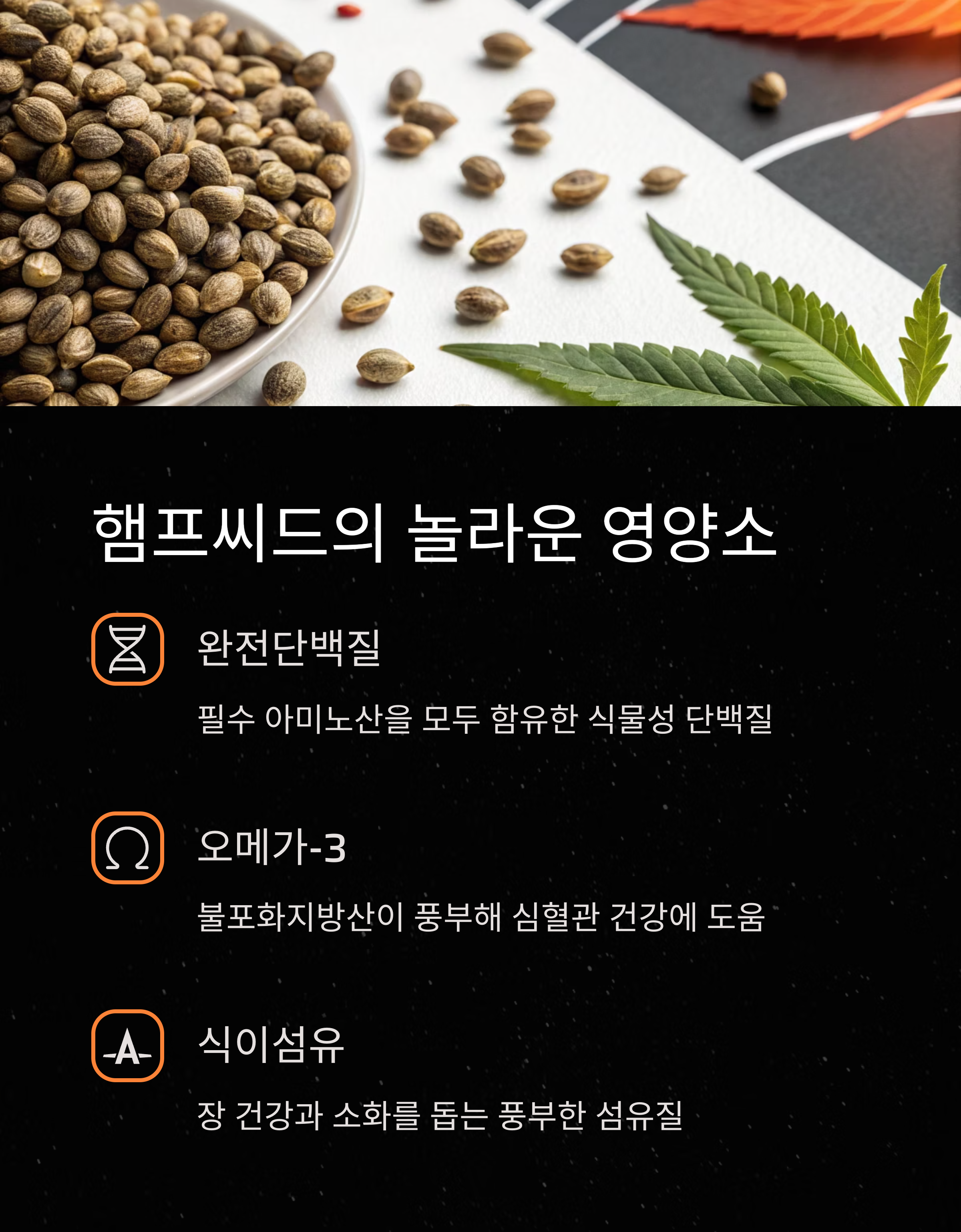 햄프씨드는 완전단백질, 불포화지방산, 식이섬유가 풍부한 슈퍼푸드로