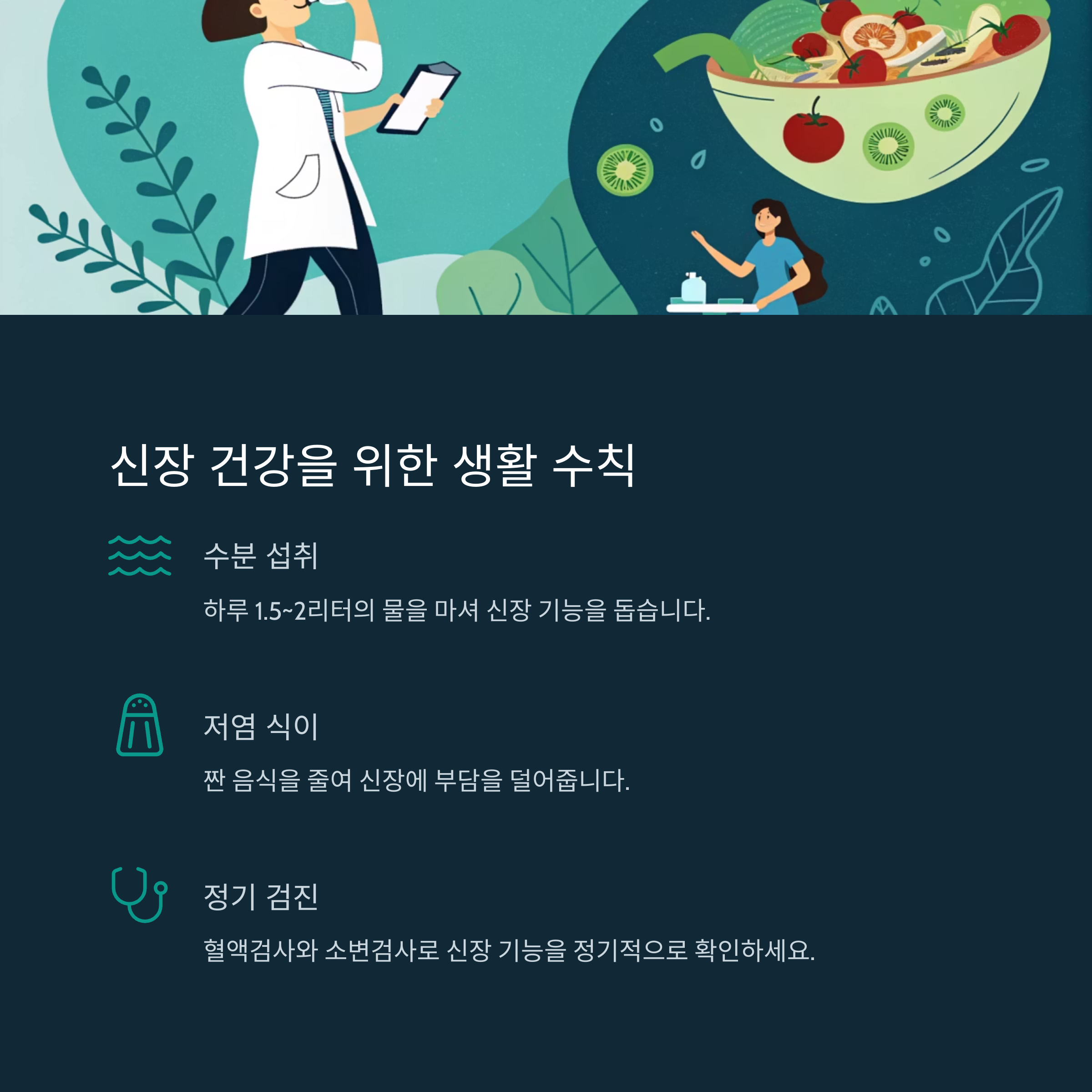 신장 질환은 조기 발견이 가장 중요합니다. 정기적인 혈액검사와 소변검사로 기능을 체크하고, 짠 음식은 피하고 수분 섭취는 충분히 하며, 약물 복용도 전문가 상담을 통해 진행하는 것이 좋습니다. 또한 고혈압이나 당뇨병을 관리하고 금연과 절주를 실천하는 것도 예방의 핵심입니다.