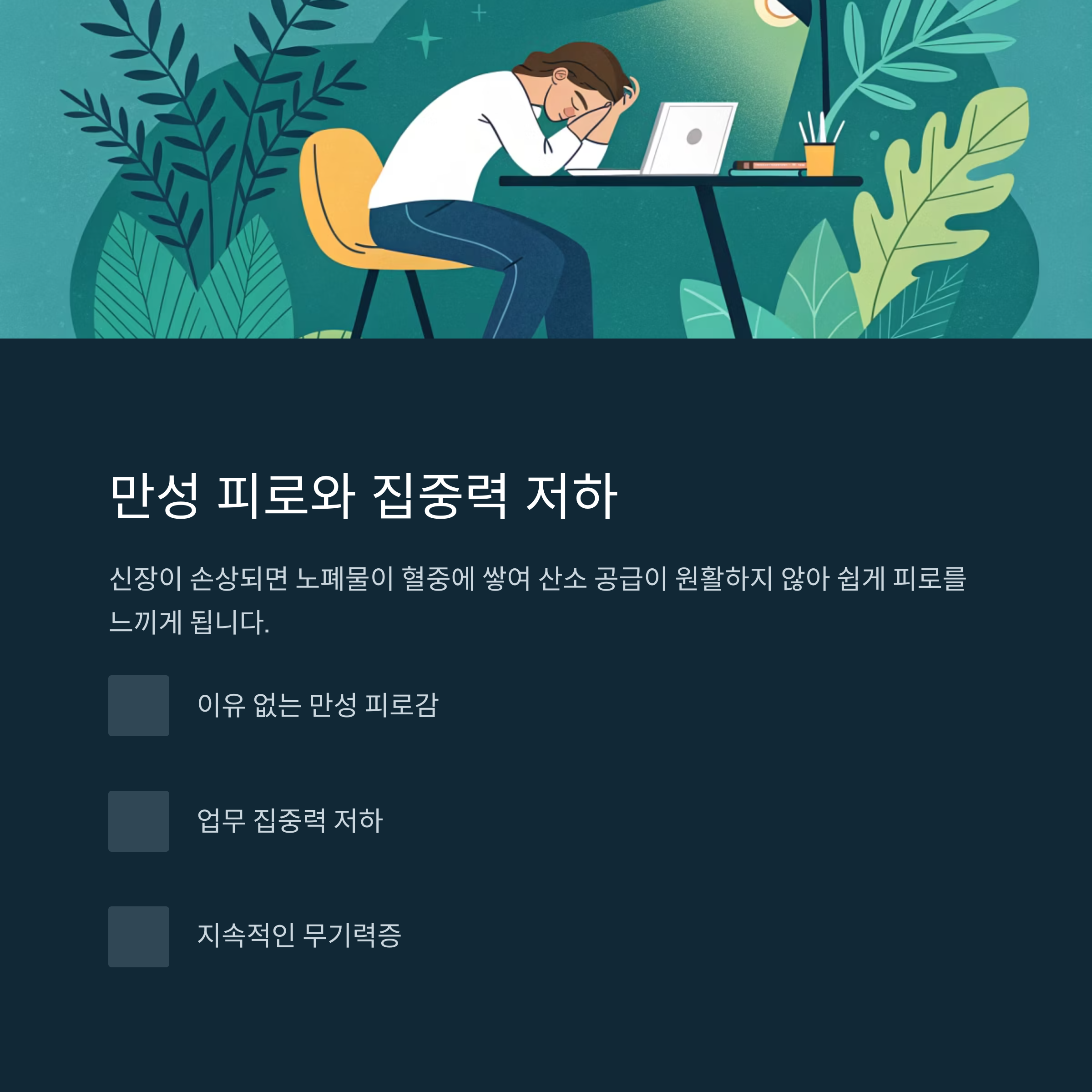 노폐물이 혈중에 쌓이면 체내 산소 공급이 원활하지 않아 쉽게 피로를 느끼게 됩니다. 신장이 손상될 경우 만성 피로, 업무 집중력 저하, 무기력증이 서서히 찾아올 수 있습니다. 다른 질환 없이 이런 증상이 계속된다면 신장 검진이 필요합니다.