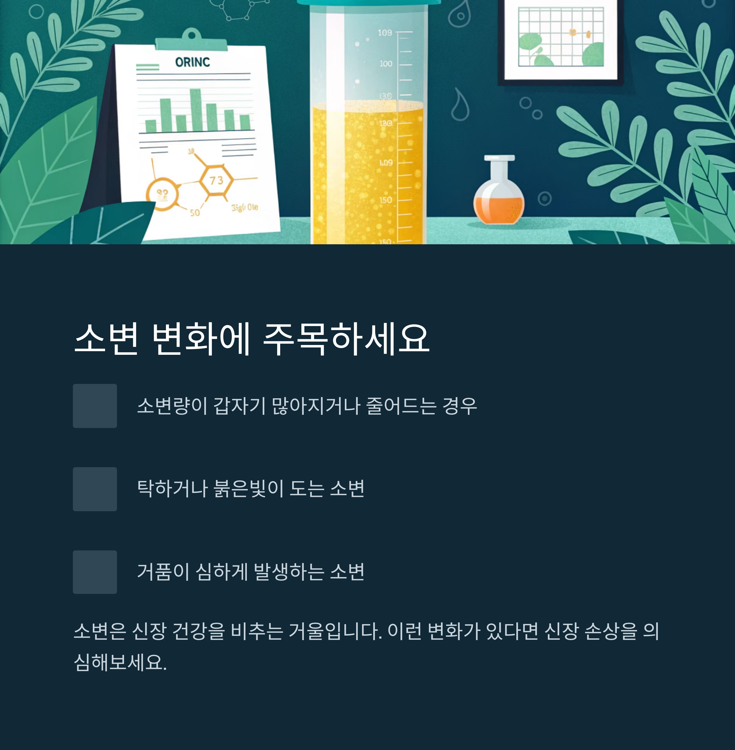 | 소변 변화 | 탁한 소변, 거품, 붉은 소변, 냄새 변화 |