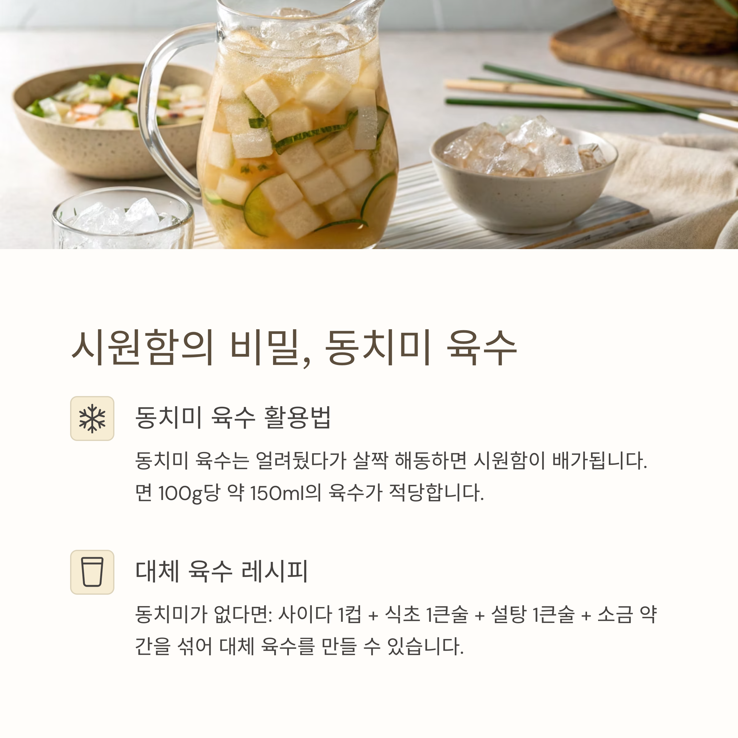 동치미 육수를 사용할 경우 얼려뒀다가 살짝 해동하면 시원함이 배가됩니다