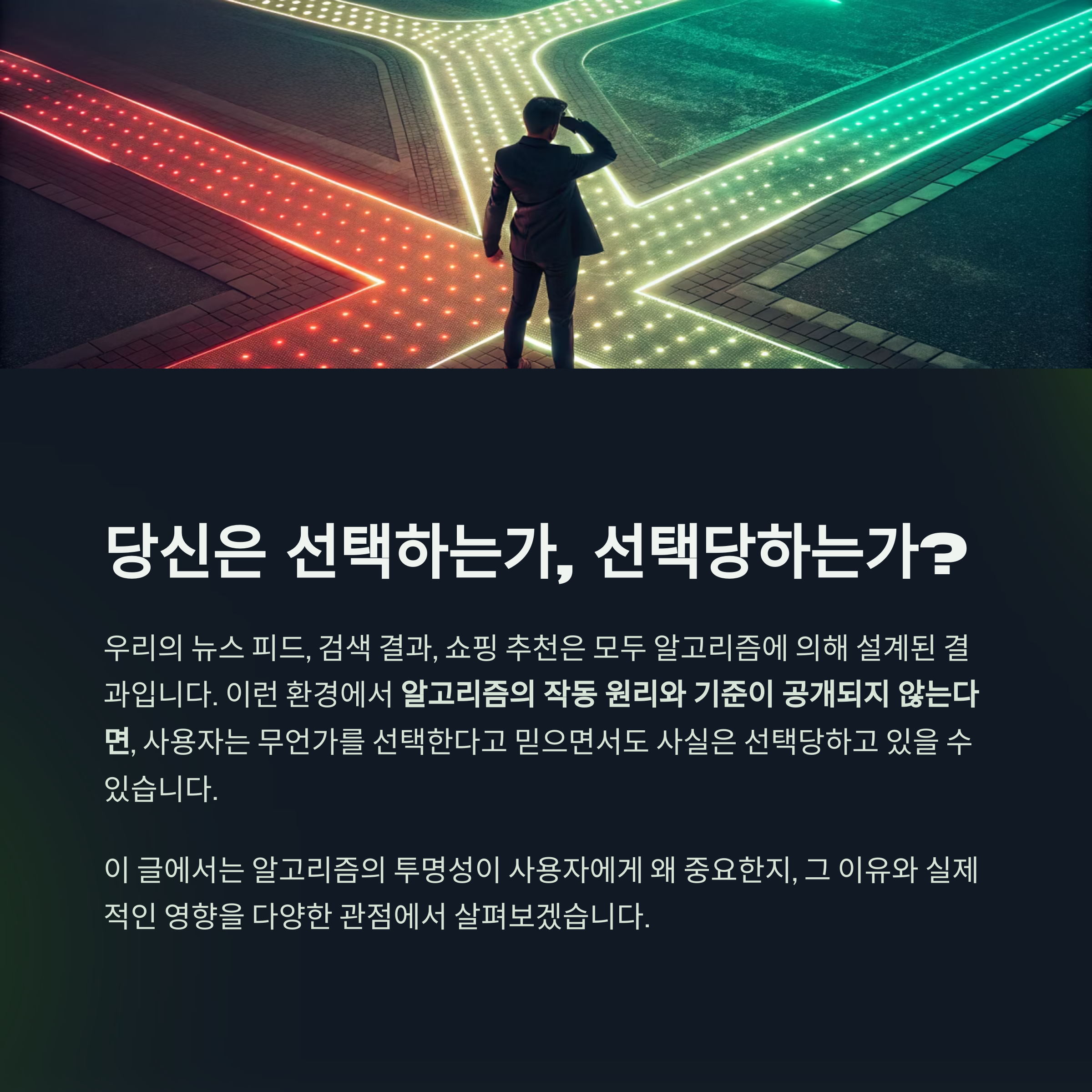 이런 환경에서 알고리즘의 작동 원리와 기준이 공개되지 않는다면, 사용자는 무언가를 선택한다고 믿으면서도 사실은 선택당하고 있을 수 있습니다.