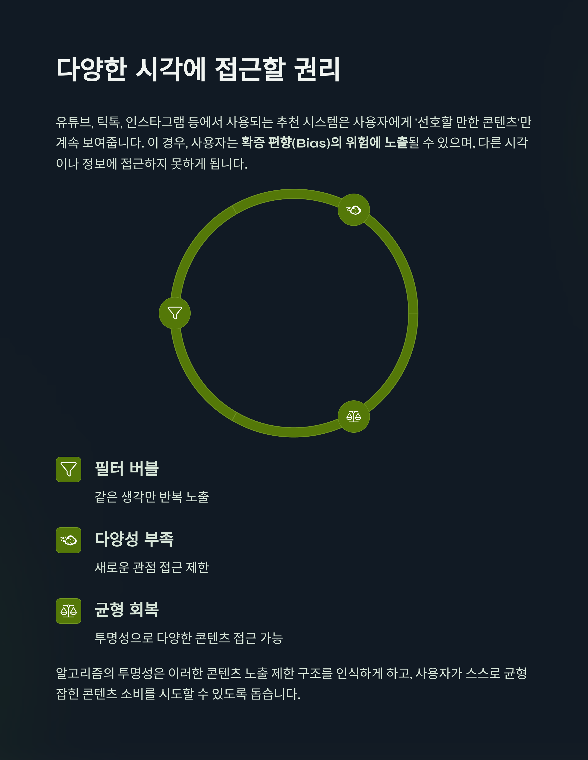 알고리즘의 투명성은 이러한 콘텐츠 노출 제한 구조를 인식하게 하고,