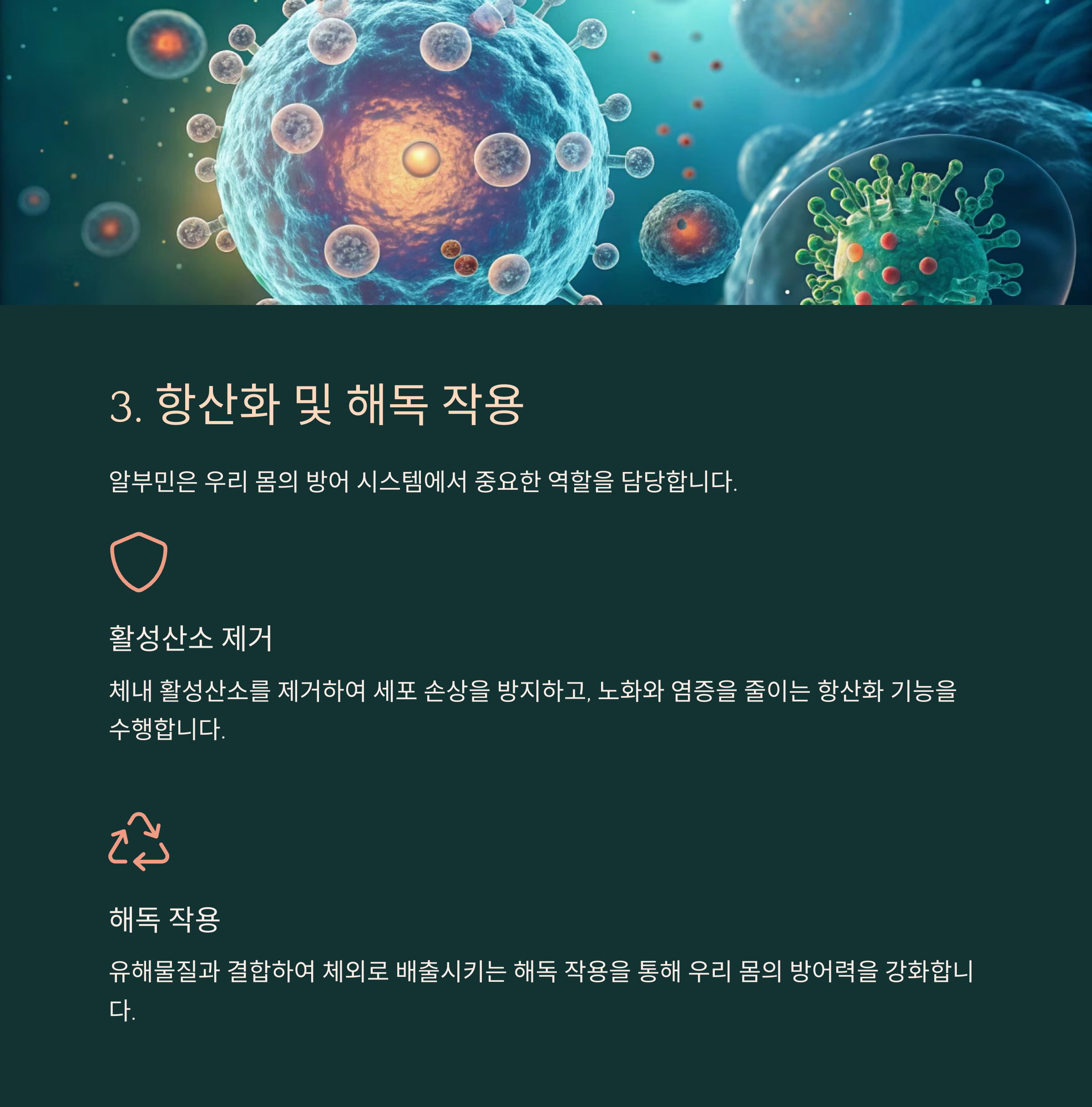 알부민은 체내 활성산소를 제거하여 세포 손상을 방지하고, 노화와 염증을 줄이는 항산화 기능을 가집니다.