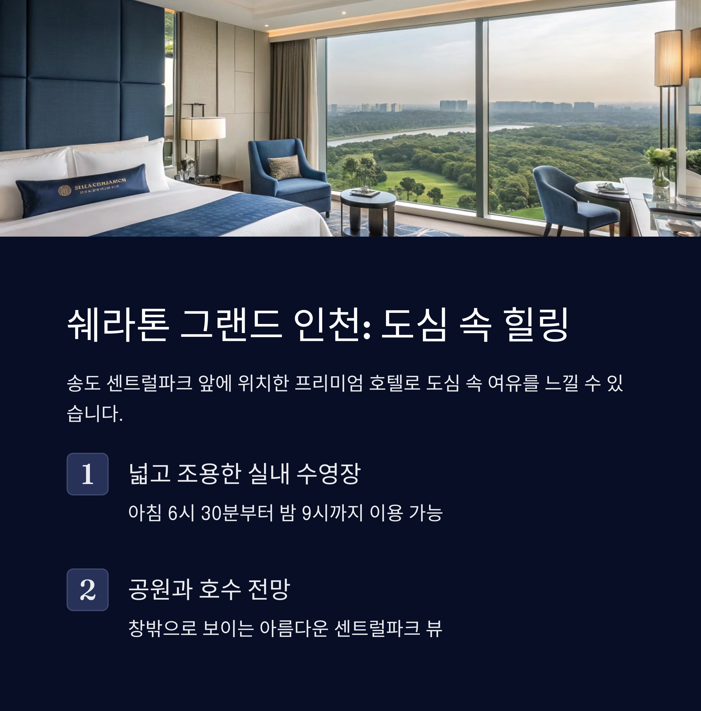 서울과 가까우면서도 공항 접근성이 뛰어난 인천은 짧은 휴가를 보내기 위한 호캉스 명소로 주목받고 있습니다. 특히 송도와 영종도를 중심으로 최고급 시설을 갖춘 호텔들이 여름철 다양한 고객층을 만족시키고 있는데요. 이번 글에서는 인천을 대표하는 프리미엄 호텔 세 곳을 소개하며 각각의 특징과 추천 이유를 정리해드립니다.