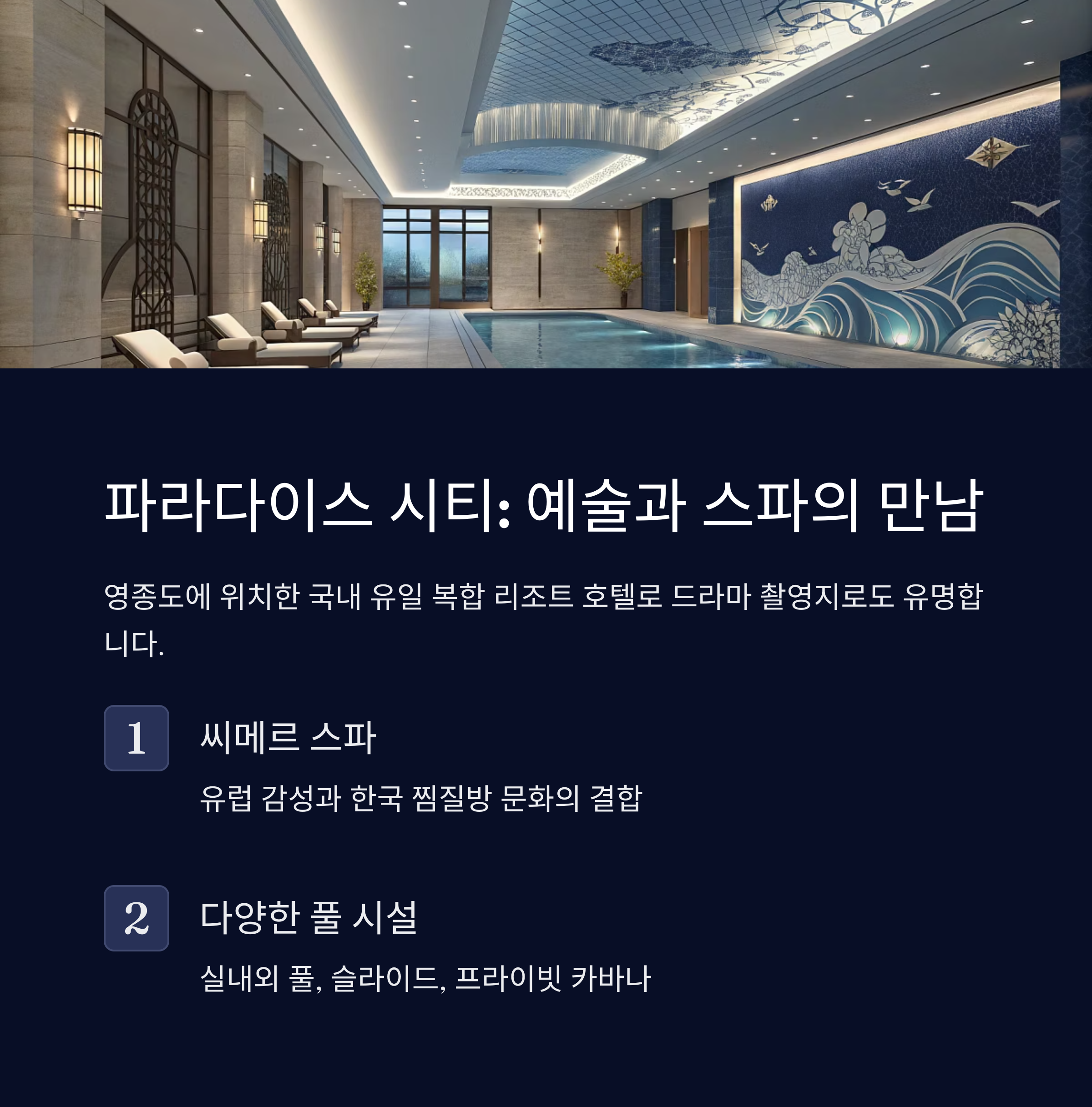 | 파라다이스 시티 | 씨메르 스파, 아트 전시, 다양한 풀 시설 | 영종도 |
