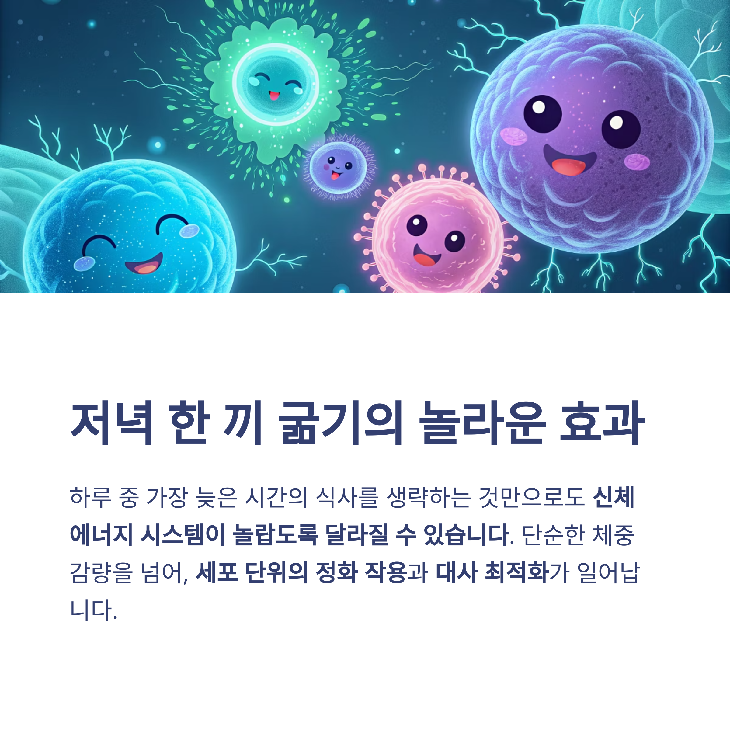 단순한 체중 감량을 넘어서, 저녁 한 끼를 굶는 습관은 세포 단위의 정화 작용과 대사 최적화를 이끌어냅니다.