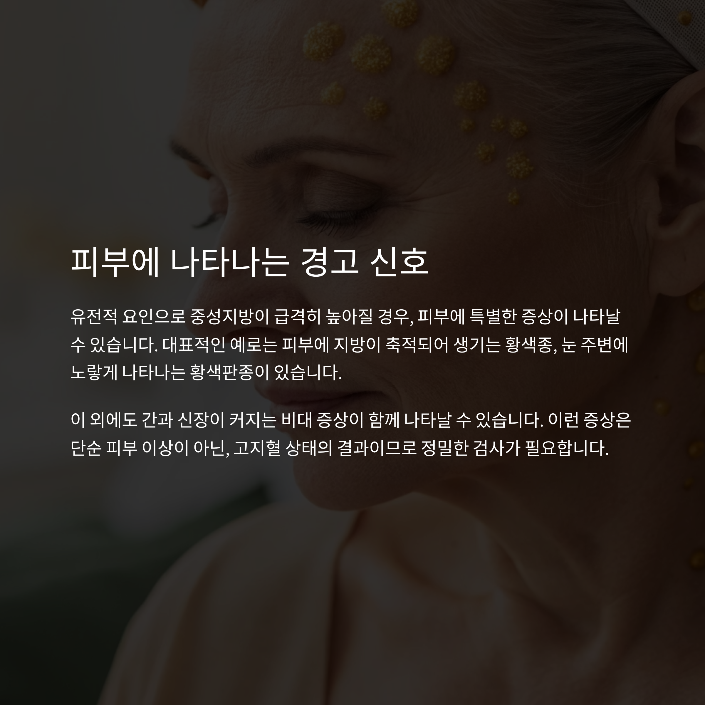 유전적 요인으로 중성지방이 급격히 높아질 경우에는 특별한 신체 증상이 동반되기도 합니다. 대표적인 예로는 피부에 지방이 축적되어 생기는 황색종, 눈 주변에 노랗게 나타나는 황색판종 등이 있습니다. 이 외에도 간과 신장이 커지는 비대 증상이 함께 나타날 수 있습니다. 이런 증상은 단순 피부 이상이 아닌, 고지혈 상태의 결과이므로 정밀한 검사가 필요합니다.