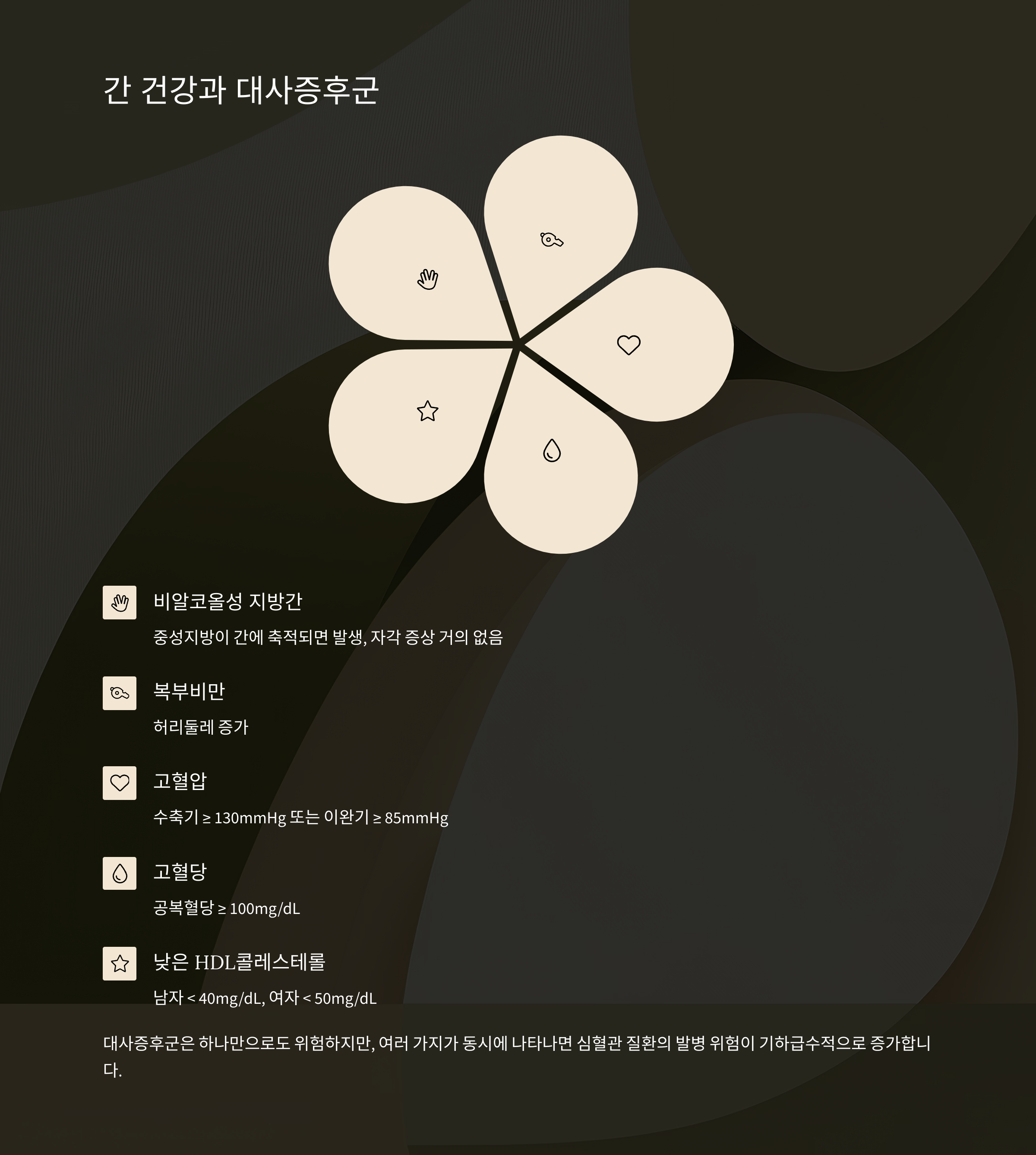 대사증후군은 하나만으로도 위험하지만, 여러 가지가 동시에 나타나면 심혈관 질환의 발병 위험이 기하급수적으로 증가합니다.