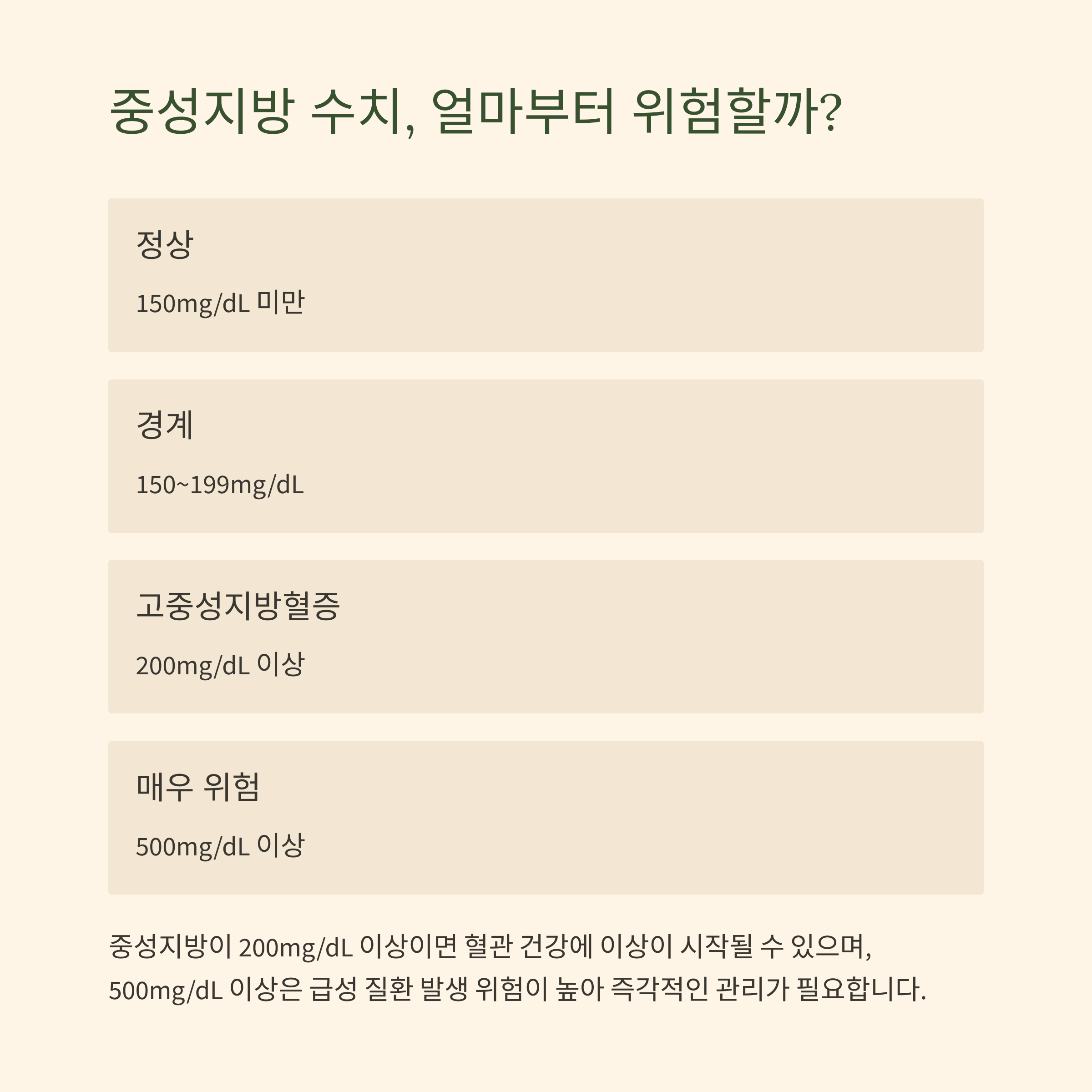 중성지방이 200mg/dL 이상일 경우에는 혈관 건강에 이상이 시작될 수 있으며, 500mg/dL 이상이면 급성 질환이 발생할 수 있어 즉각적인 관리가 필요합니다.