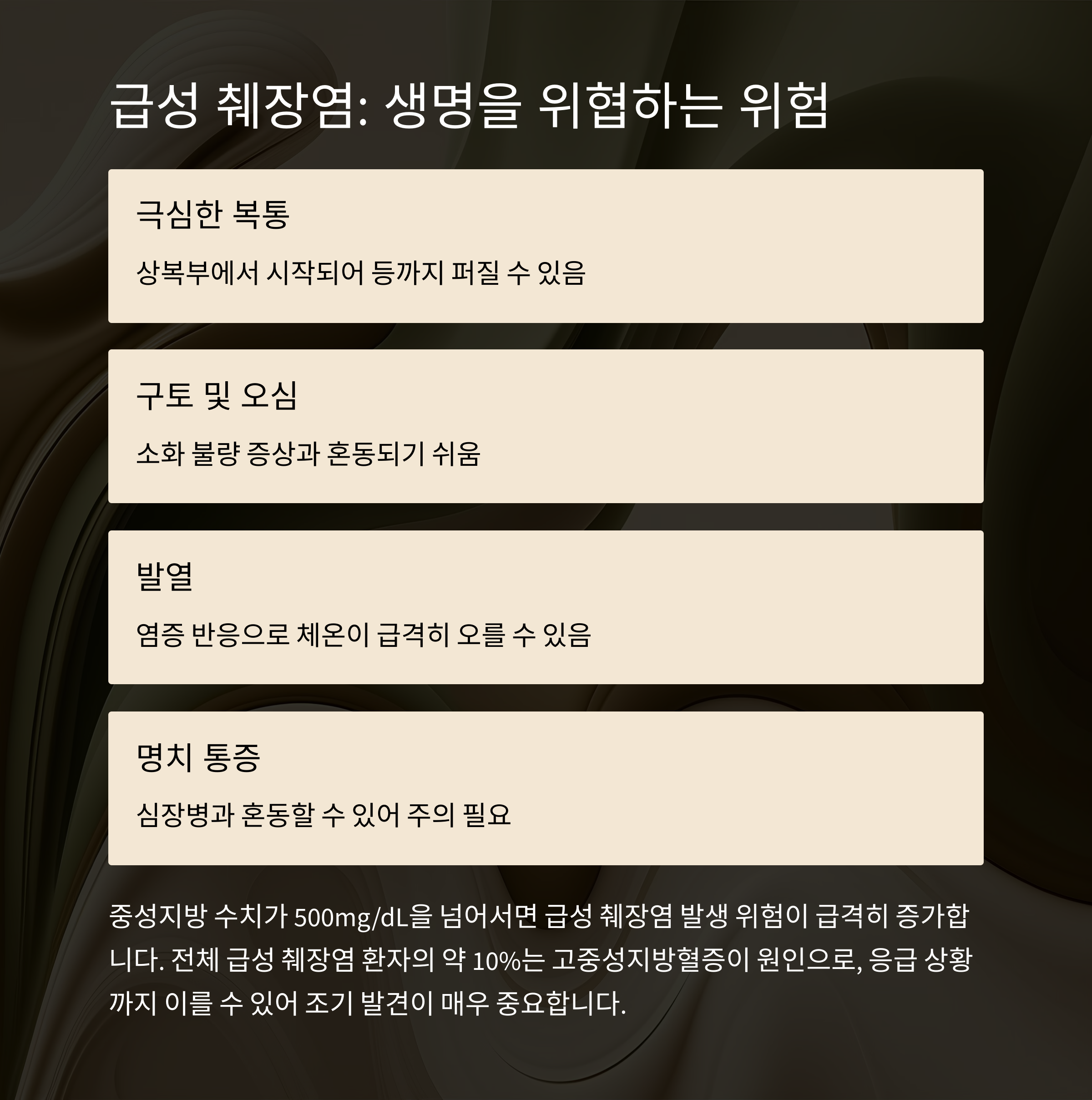 중성지방 수치가 500mg/dL을 넘어서면 급성 췌장염 발생 위험이 급격히 증가합니다. 이때 나타나는 증상은 다음과 같습니다.