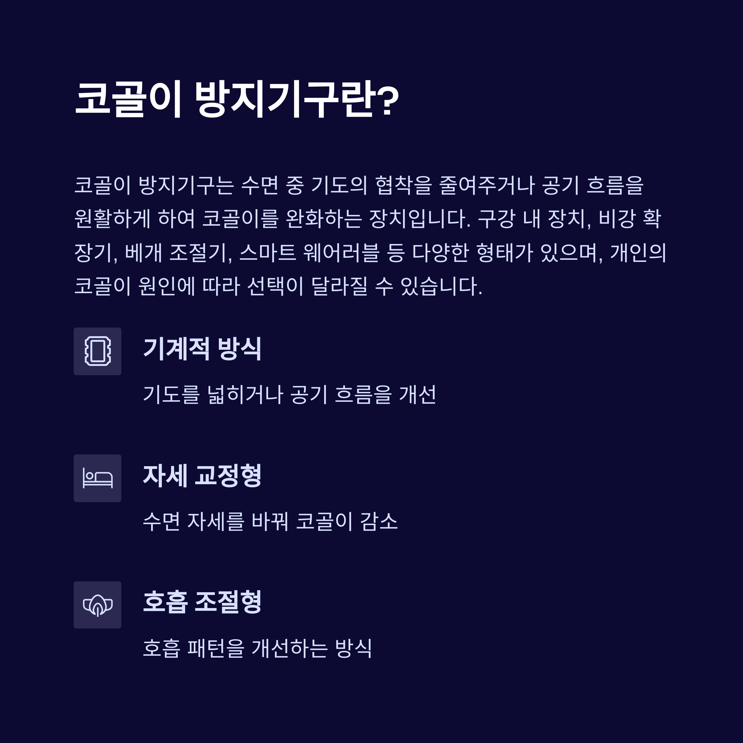 코골이 방지기구는 수면 중 기도의 협착을 줄여주거나 공기 흐름을 원활하게 하여 코골이를 완화하는 데 도움을 주는 장치입니다. 구강 내 장치, 비강 확장기, 베개 조절기, 스마트 웨어러블 등 다양한 형태가 있으며, 개인의 코골이 원인에 따라 선택이 달라질 수 있습니다. 기계적인 방식뿐 아니라, 자세를 교정하거나 호흡을 조절하는 형태의 제품도 있어 사용자 맞춤형 선택이 중요합니다.