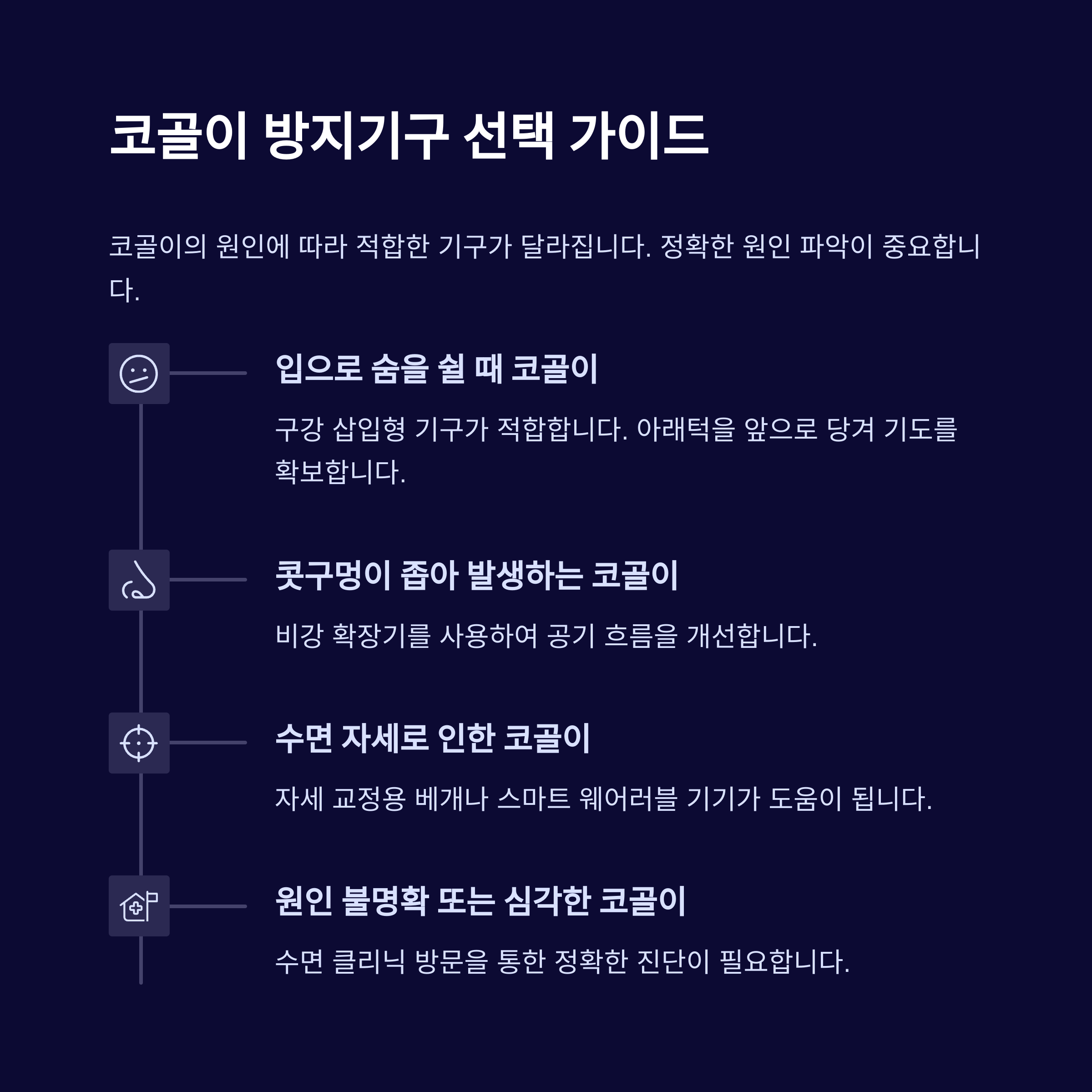코골이의 원인에 따라 기구 선택이 달라져야 합니다. 입으로 숨을 쉴 때 발생하는 코골이는 구강 기구가, 콧구멍이 좁아져 발생하는 경우에는 비강 확장기가 적합합니다. 수면 자세가 문제라면 자세 교정용 베개나 스마트 웨어러블 기기가 도움이 됩니다. 정확한 진단을 위해 수면 클리닉을 방문하는 것도 추천드립니다.
