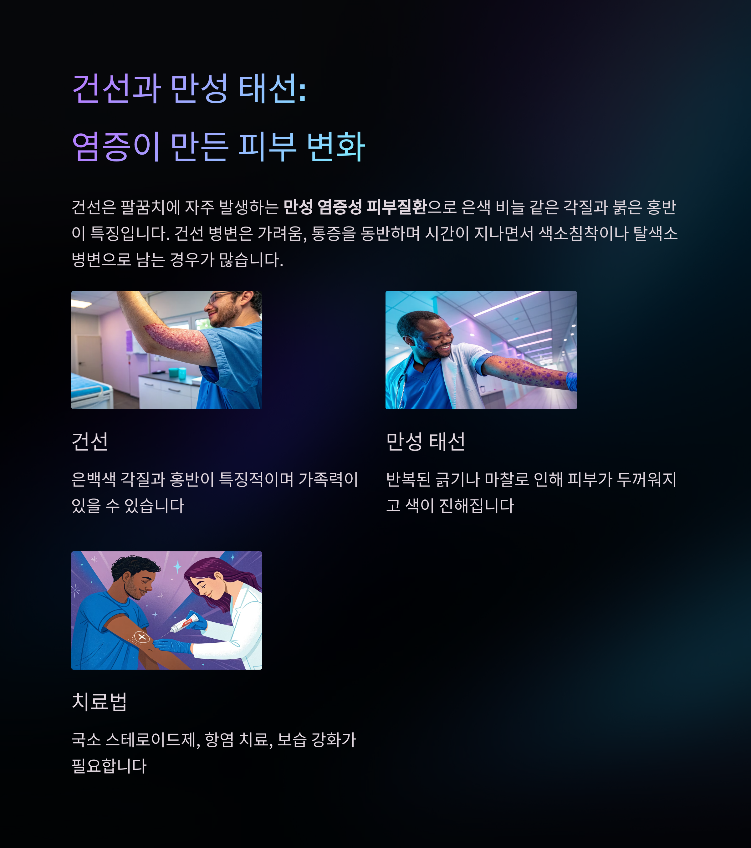 | 만성 태선 | 마찰 부위 한정, 가려움 동반 | 피부 두께, 긁는 습관 확인 |