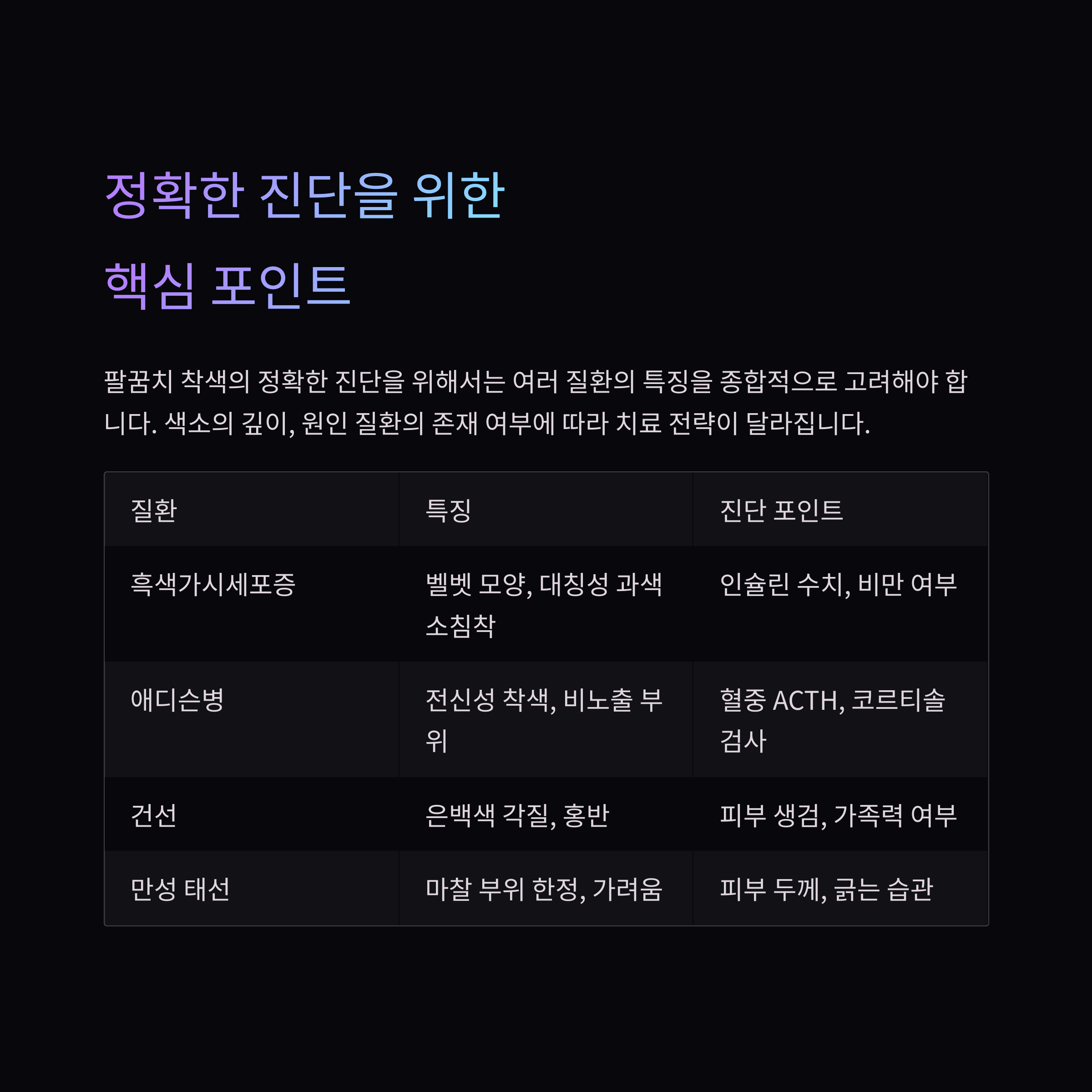 이 글에서는 흑색가시세포증, 애디슨병, 건선 등과의 감별 기준과 치료 접근법을 정리합니다