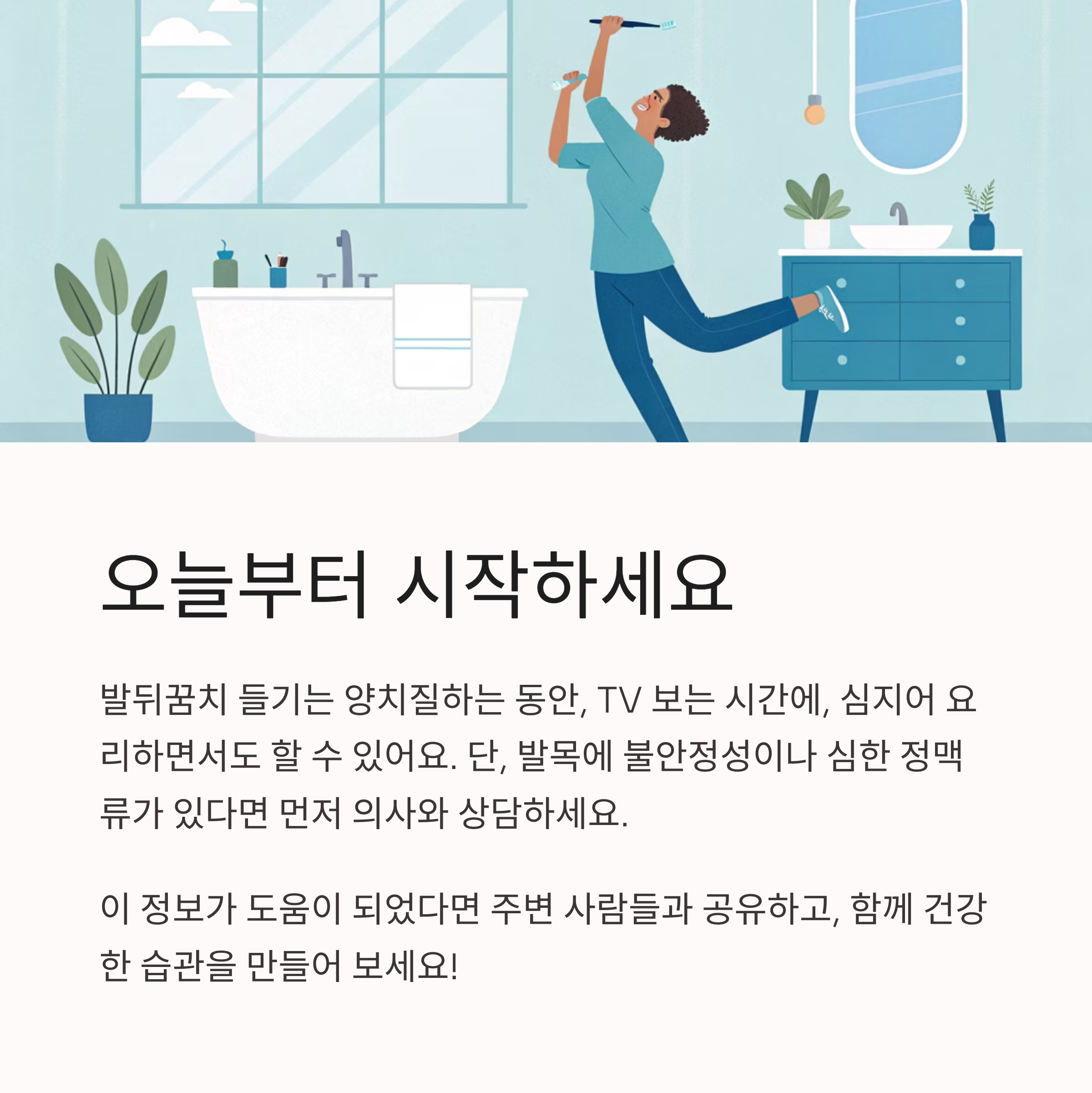 현대인에게 필수적인 순환 운동인 발뒤꿈치 들기 운동은 짧은 시간 투자로도 혈액순환과 근력 강화에 탁월한 효과를 보입니다. 특히 종아리 근육은 "제2의 심장"이라 불릴 만큼 순환계에서 중요한 위치를 차지하고 있으며, 이 운동은 그 기능을 극대화해 하지 정맥류, 부종, 기립성 저혈압 등을 예방하는 데 실질적 도움이 됩니다. 누구나 일상에서 쉽게 실천할 수 있는 만큼, 꾸준한 습관이 건강을 좌우합니다.