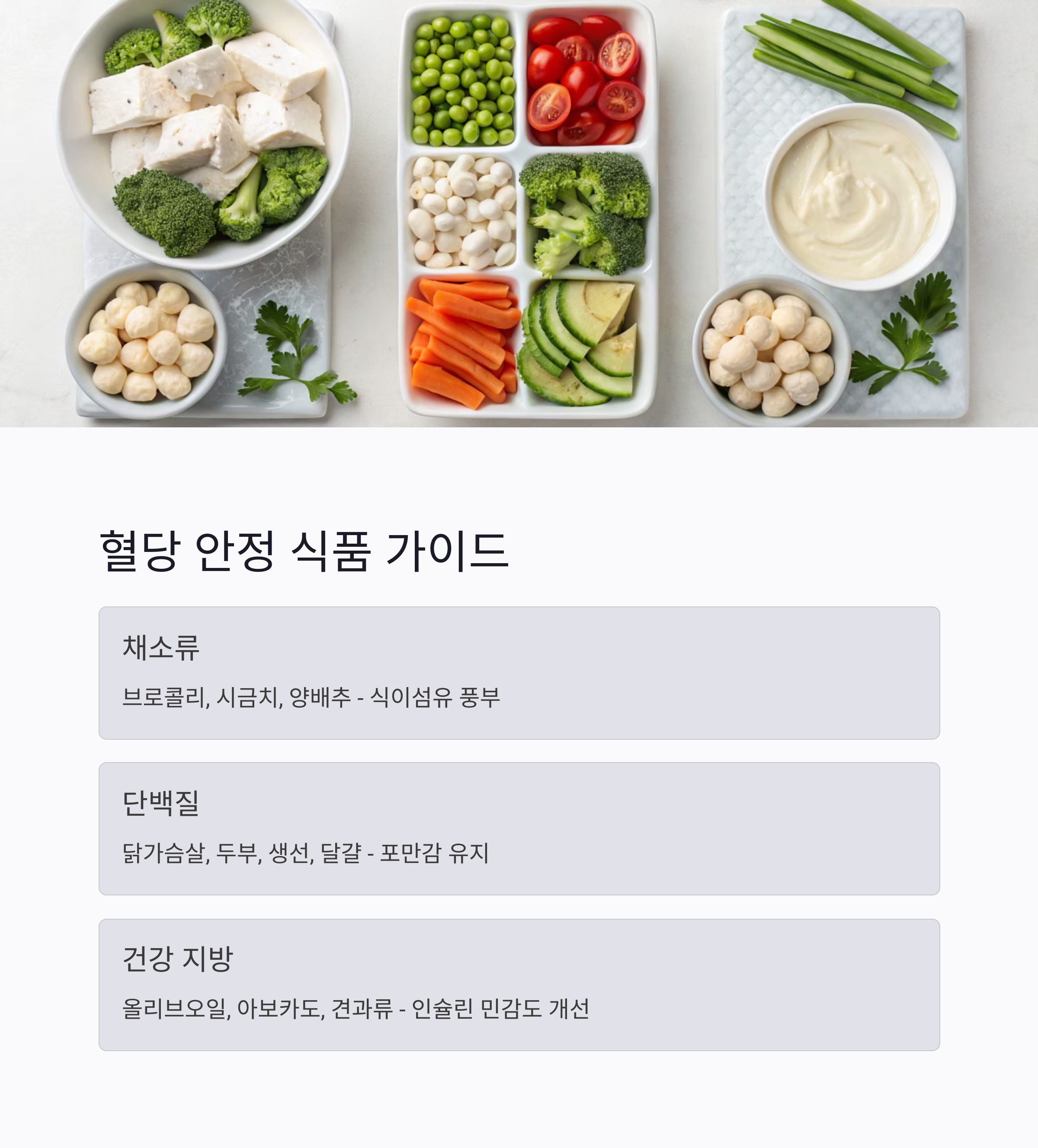 | 단백질 | 닭가슴살, 두부, 생선, 달걀 | 포만감 유지, 혈당 안정 |