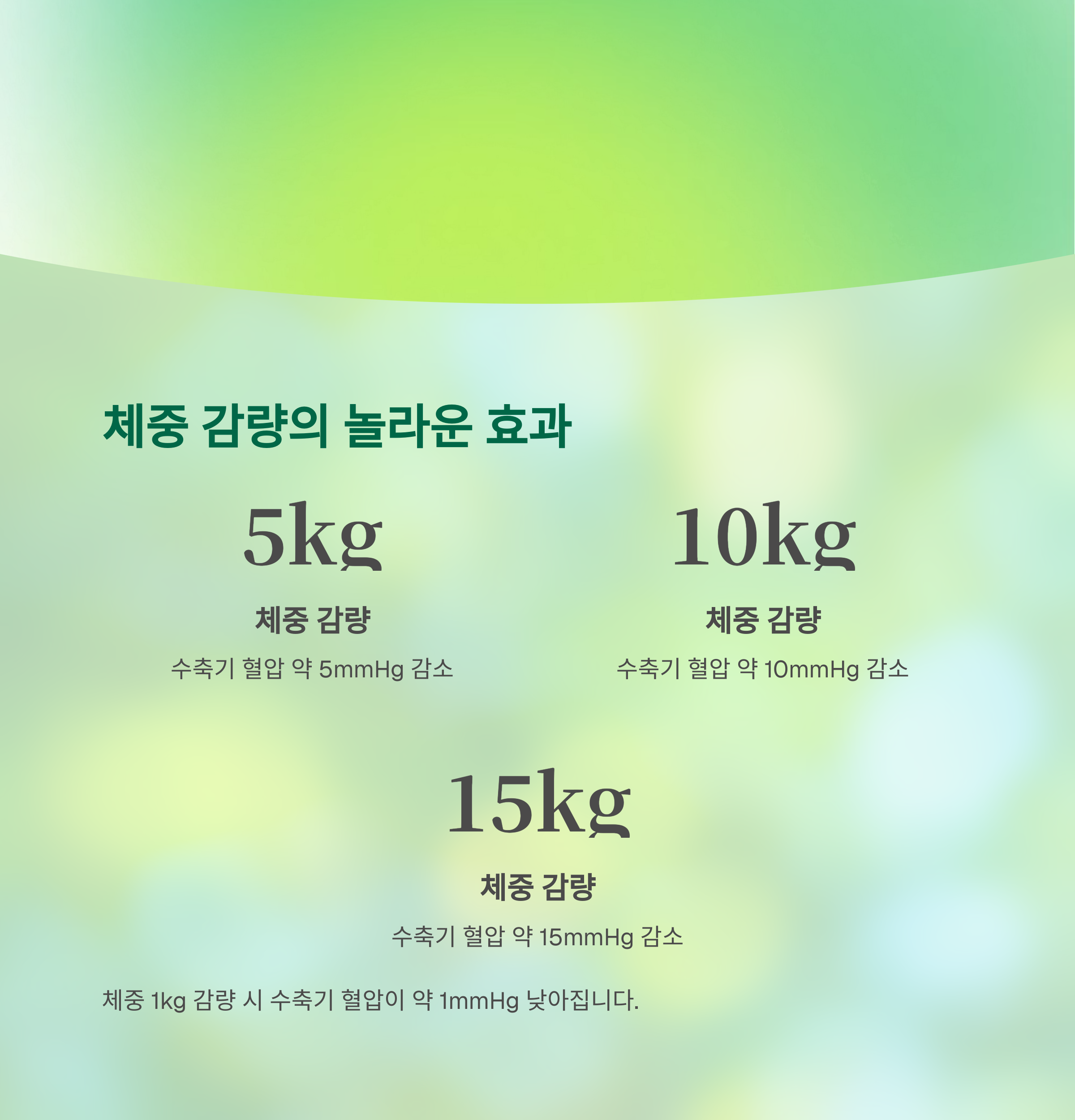 일반적으로 체중 1kg 감량 시 수축기 혈압이 약 1mmHg 정도 낮아지는 효과가 있습니다.