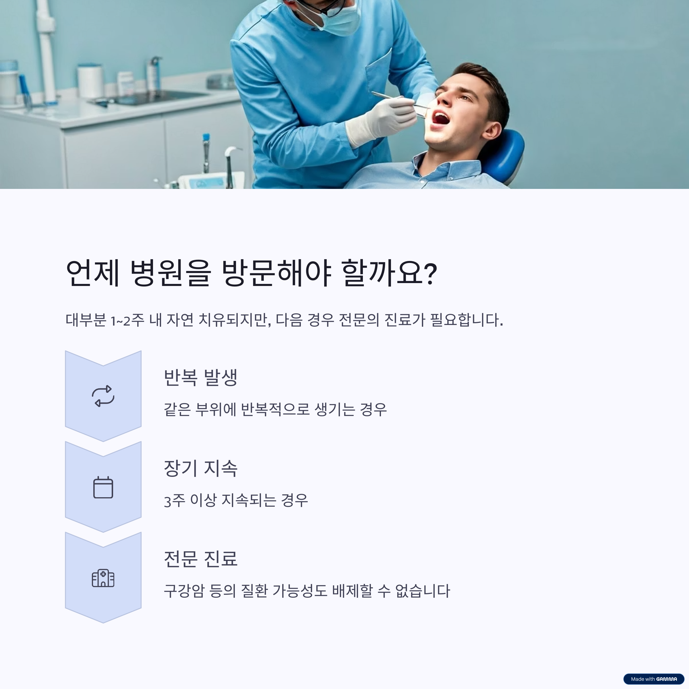 단순 염증이 아니라 구강암 등의 질환 가능성도 배제할 수 없습니다.