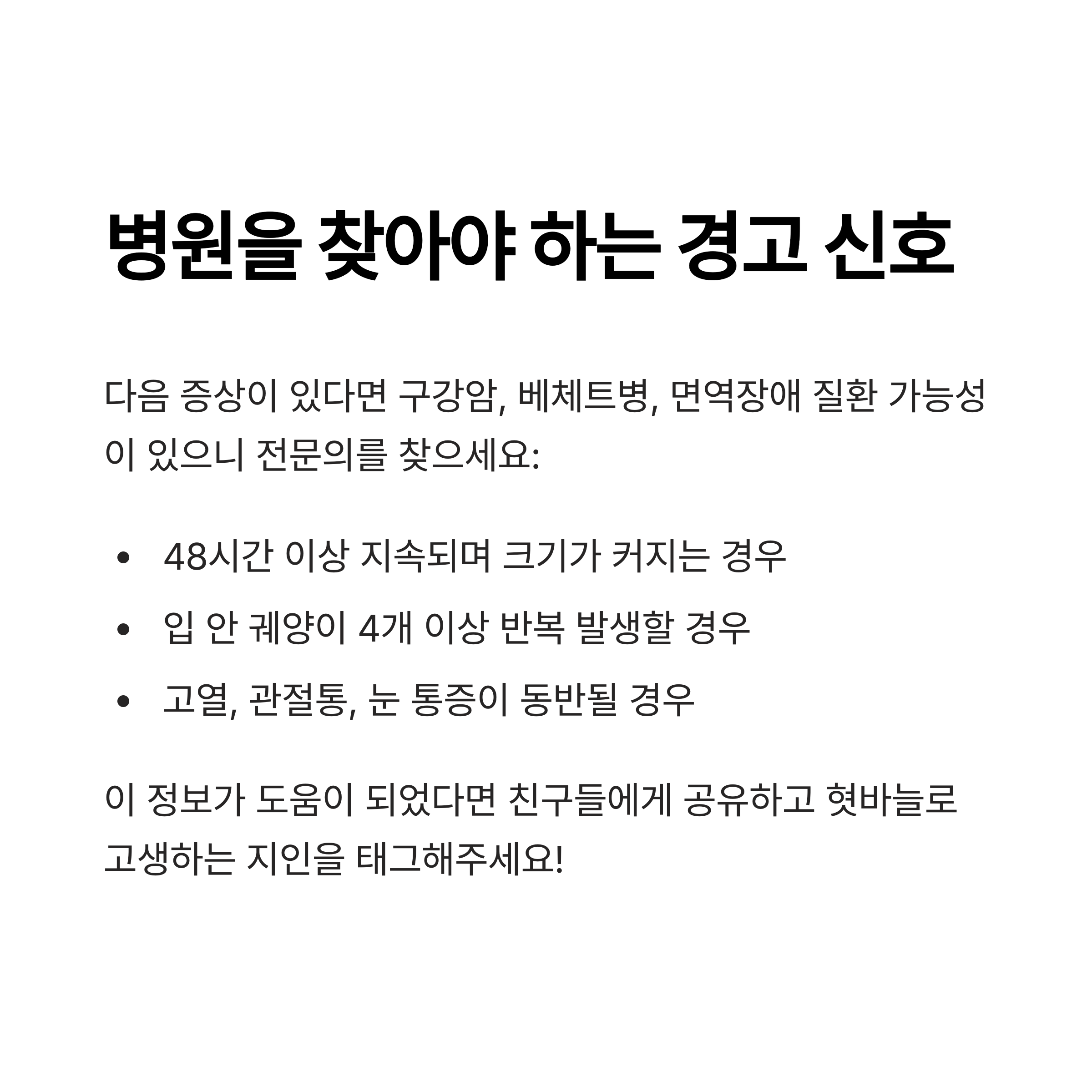 이런 경우는 구강암, 베체트병, 면역장애 질환 감별 진단이 필요합니다