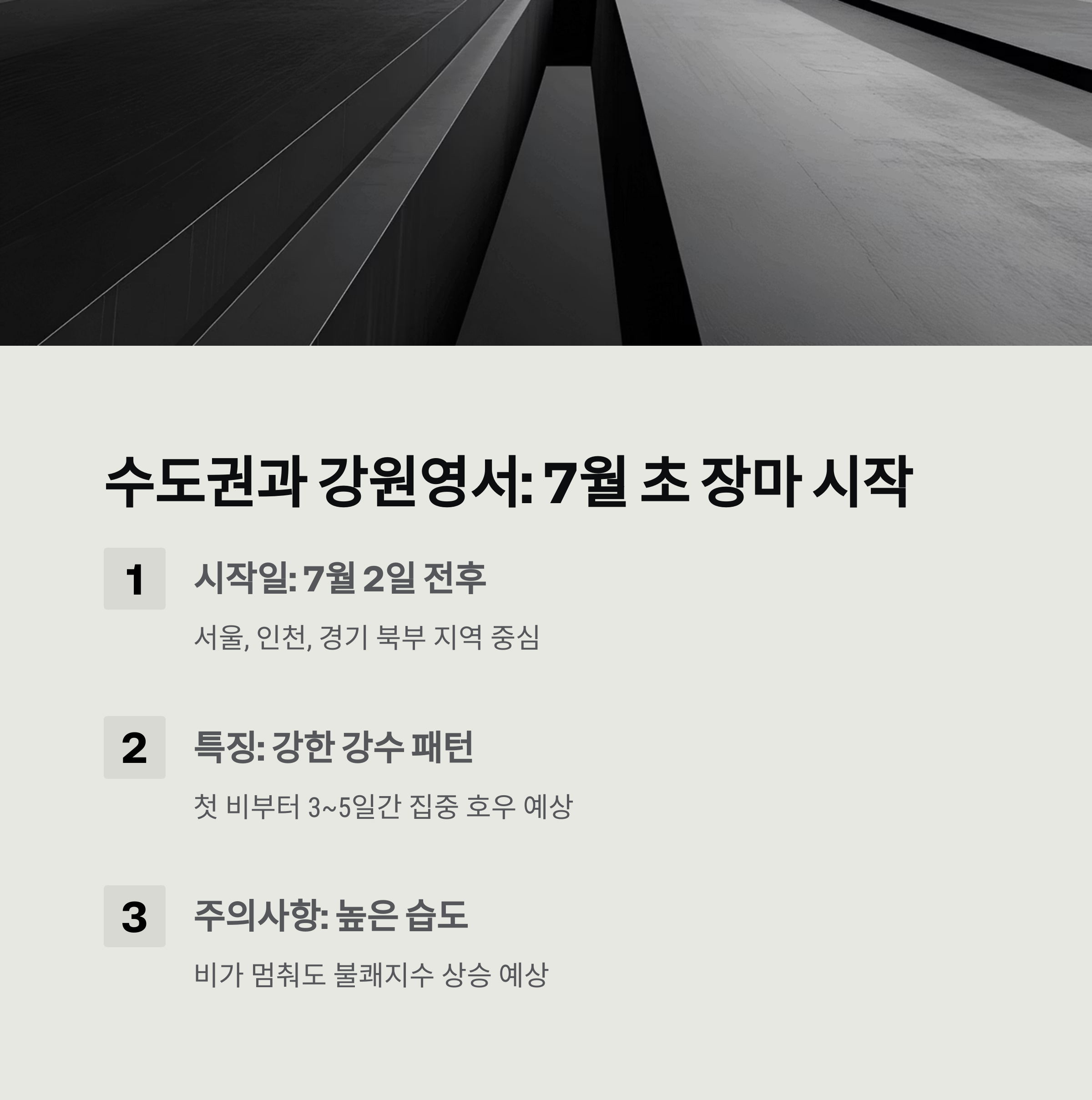 | 수도권 | 7월 2일경 | 첫 주 강수 집중, 습도 매우 높음 |