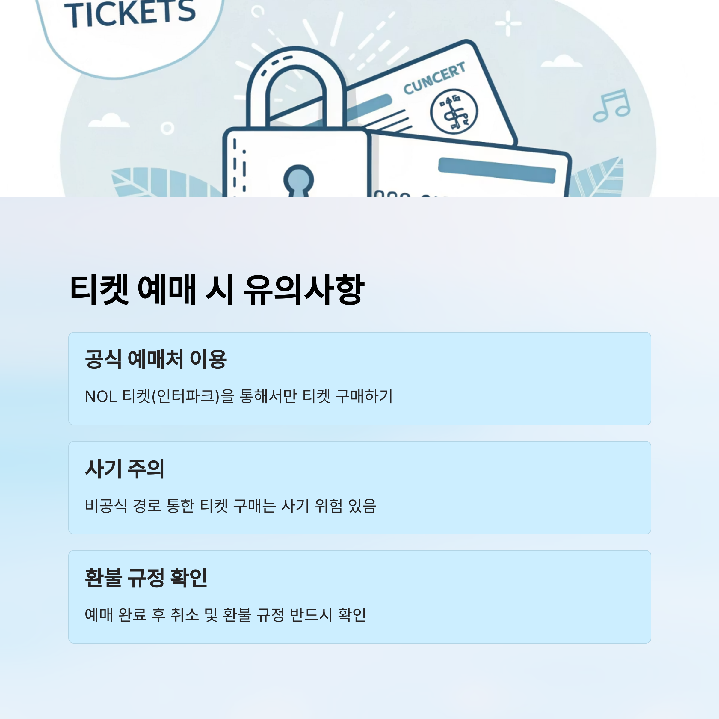 - 비공식 경로를 통한 티켓 구매는 사기 위험이 있으므로 주의하세요.