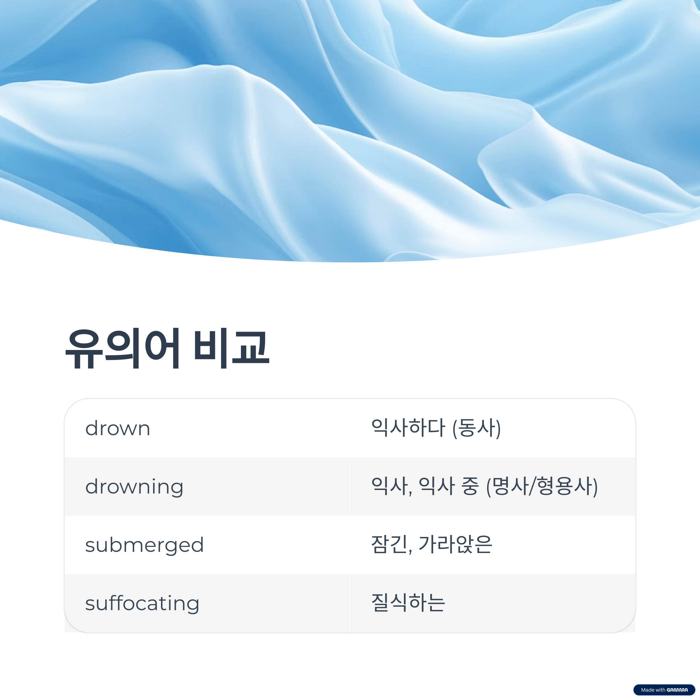 | drowning (현재분사) | 진행형, 형용사 용법 | 물에 빠져 숨 못 쉬는 중인 상태 |